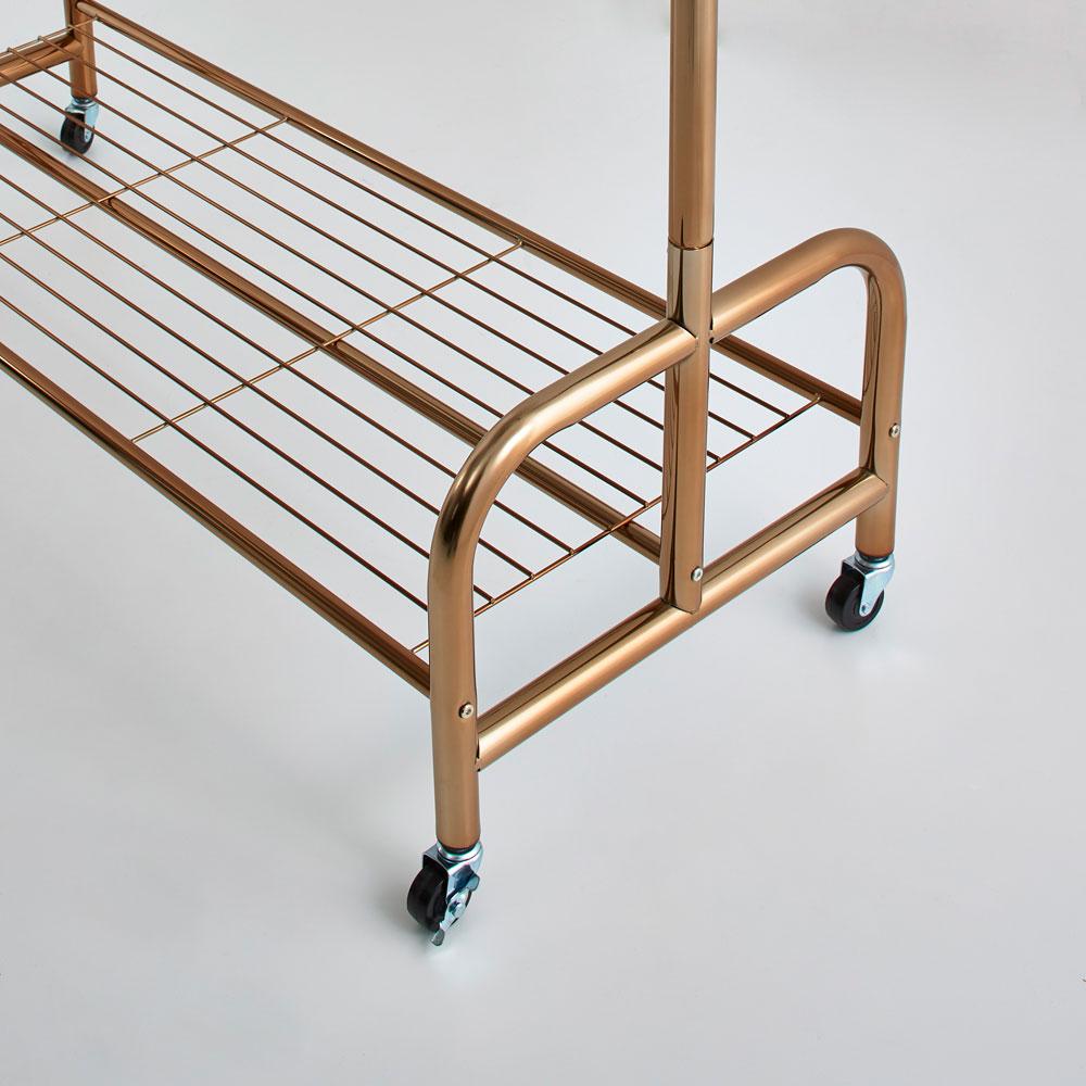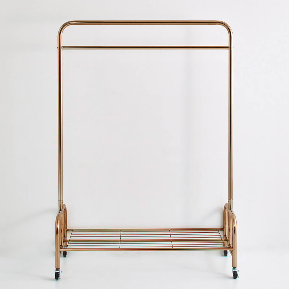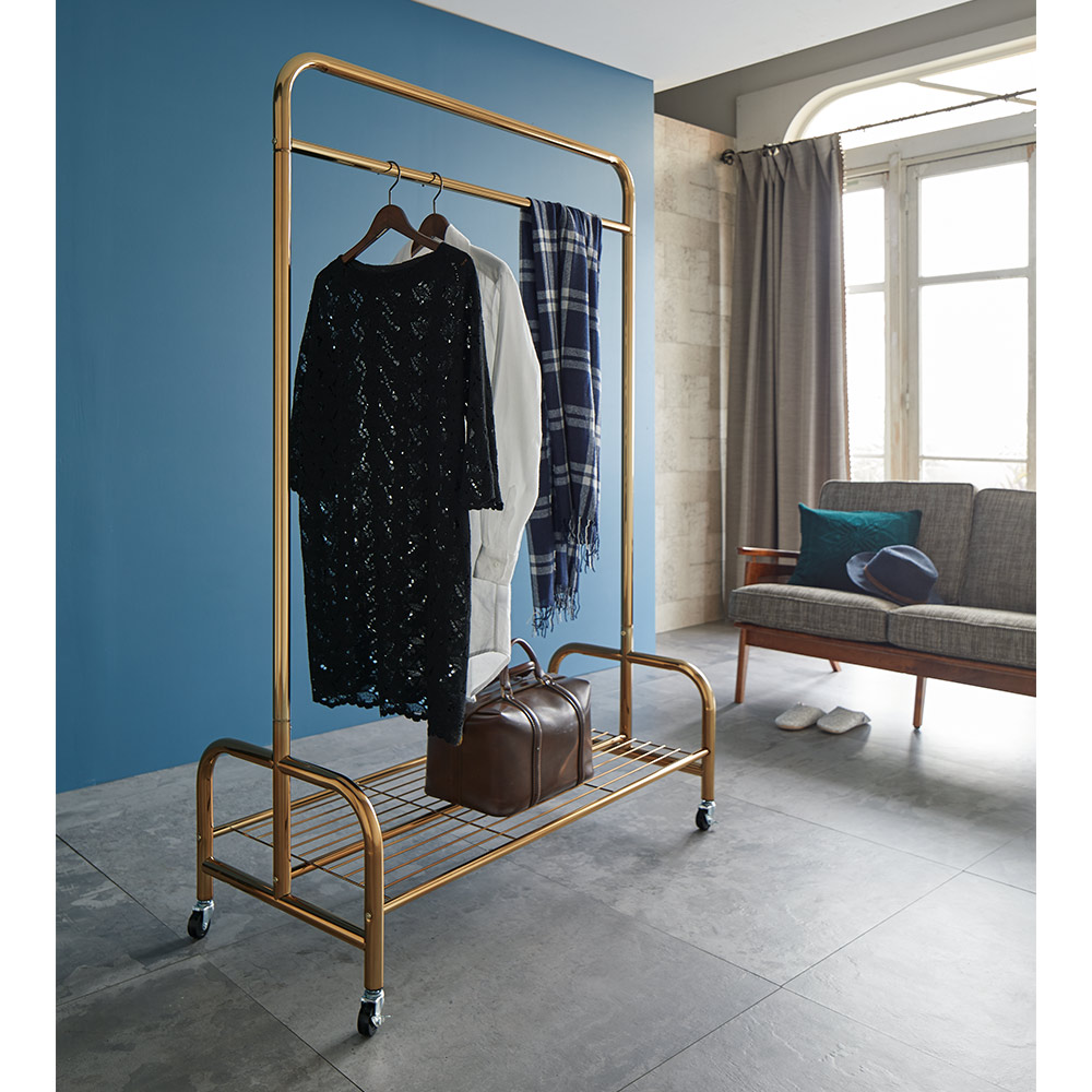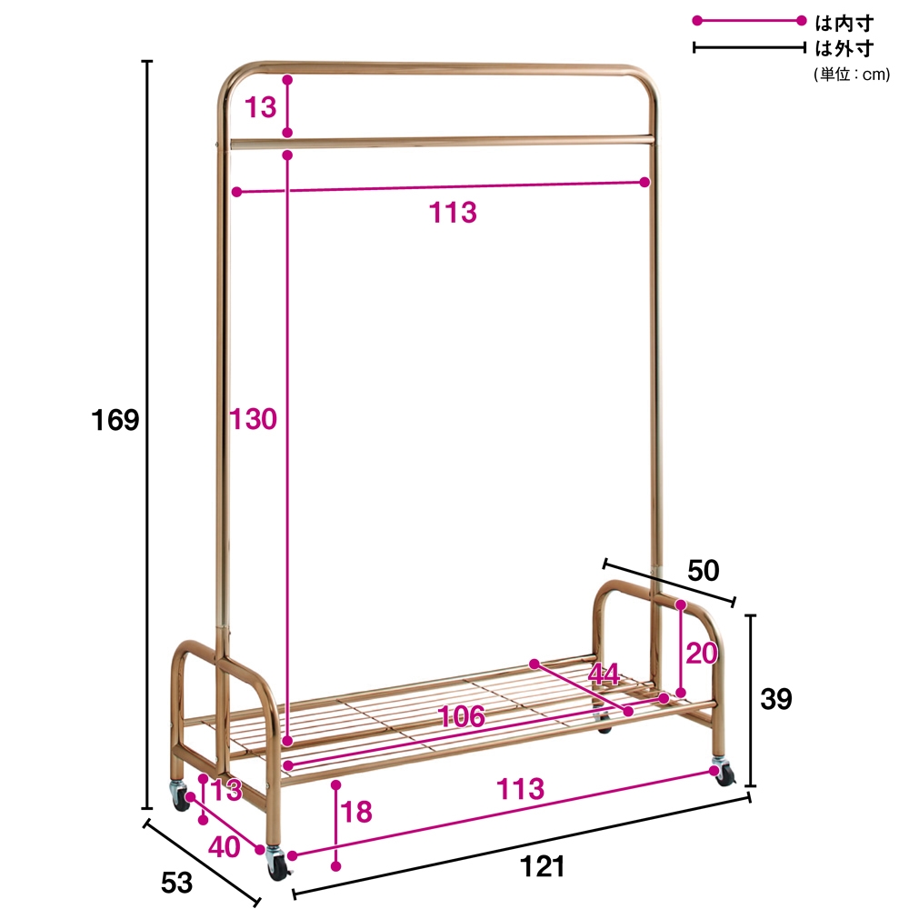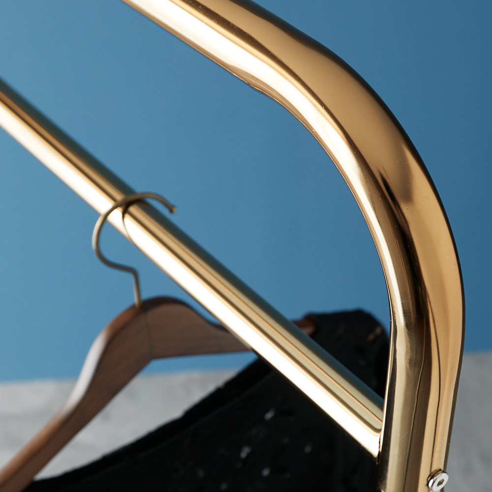 ゴールドカラーでリッチなたたずまいのシングルハンガー。棚板付きなのでバッグやストールなど小物の収納もできる便利なハンガー収納です。一流ホテルを思わせるリッチなたたずまいのシングルハンガー◆ゴールドカラーと太めのパイプで、シンプルデザインながら存在感があります。◆幅61cm・91cm・121cmの3サイズ展開ご用意しています。普段使いにも、来客の際にも活躍◆下部には棚板付きで、ゲストを迎えた際にもバッグの置き場所として活躍します。 バッグだけでなく、スリッパや小物の収納場所としても重宝します。◆床からハンガー部までは約150cm。女性でも手が掛けやすく、使いやすいサイズ感です。◆キャスター付きなので移動も楽に行えます。掃除も楽に行えます。◆普段着を掛けるコートハンガーとしても重宝できます。◆毎朝の洋服選びが快適になるおすすめのハンガー収納です。