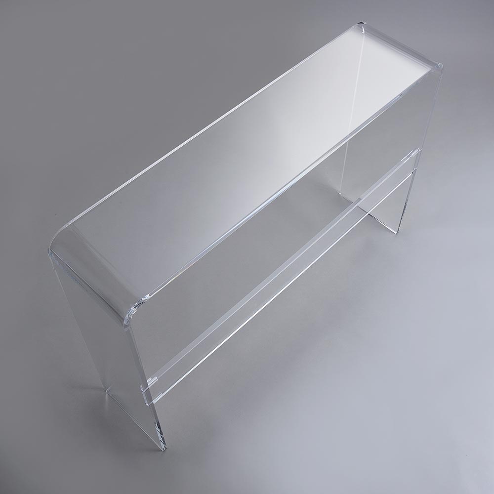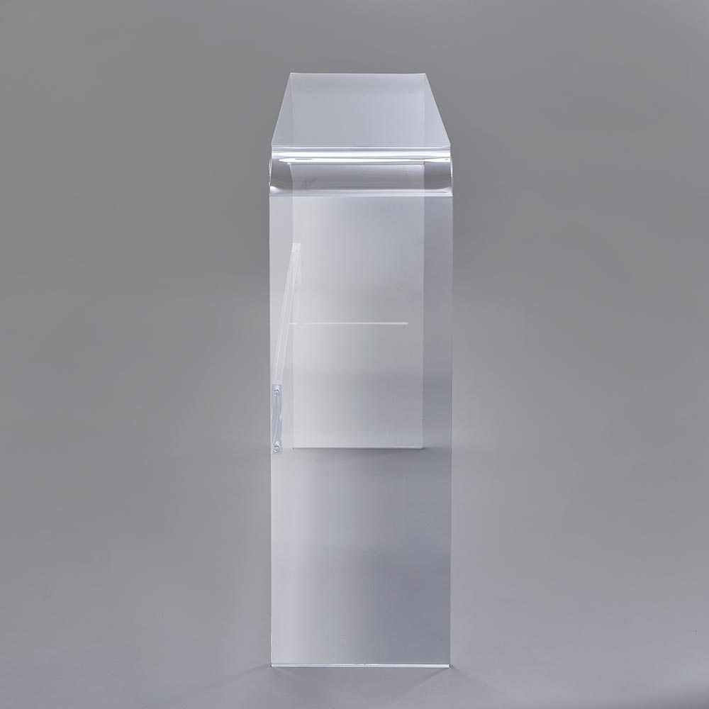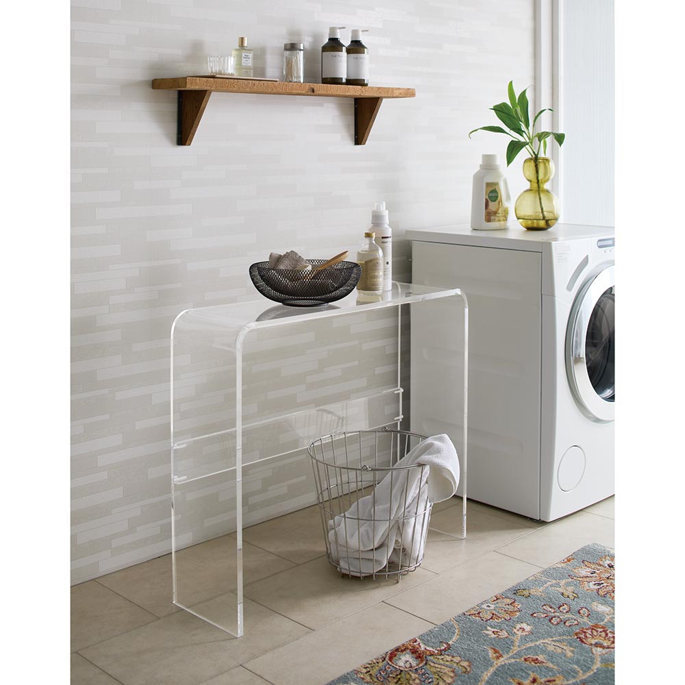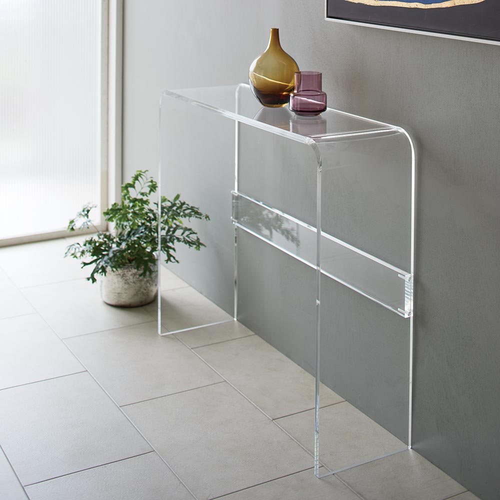 厚みのあるアクリルを贅沢に使用。余裕のない空間にも広がりと輝きを与えるクリアな素材で狭い廊下や玄関などもあっという間におしゃれに。シンプルなデザインで、ドレッサー代わりやディスプレイラックとしても。インテリアを損なわず、すっきりと美しい空間を演出。透明な輝きが美しい、おしゃれなアクリルコンソールテーブル■たっぷり15mmの厚みのあるアクリルを使用して作った、シンプルなコンソールテーブル。■一枚のアクリルを曲げることで可能な限りシンプルな形に。■無駄のないシルエットが、透き通るような美しさをより際立たせます。圧迫感を感じさせないデザインで、廊下や玄関、狭いお部屋にもぴったり。■本体奥行きは25cmととてもスリム。廊下や玄関、リビングのデッドスペースに。■クリア素材なので、見た目にも圧迫感が軽減され、すっきりとした印象に。シンプルな形でも使い方いろいろ。ドレッサーにも、ディスプレイラックにも。■完全クリアなので、壁にかけた姿見の真ん前においても便利。■クリアコンソールの上を簡易ドレッサーとしてお使いいただけます。■クリアな見た目で、存在感を感じさせないたたずまいが、ディスプレイスペースとしてもお勧め。■お気に入りのオブジェや時計、フォトフレームなどをまとめてデコレーションも素敵。簡単組立ですぐにお使いいただけます。■背面の補強用のアクリル板をネジで止めるだけの簡単組立。すぐにお使いいただけます。■ネジも透明なアクリル製で、美しさを損なわないようこだわりました。