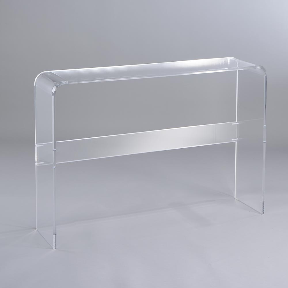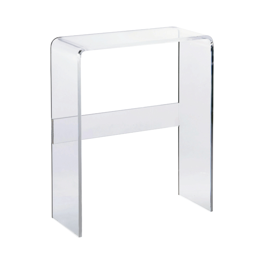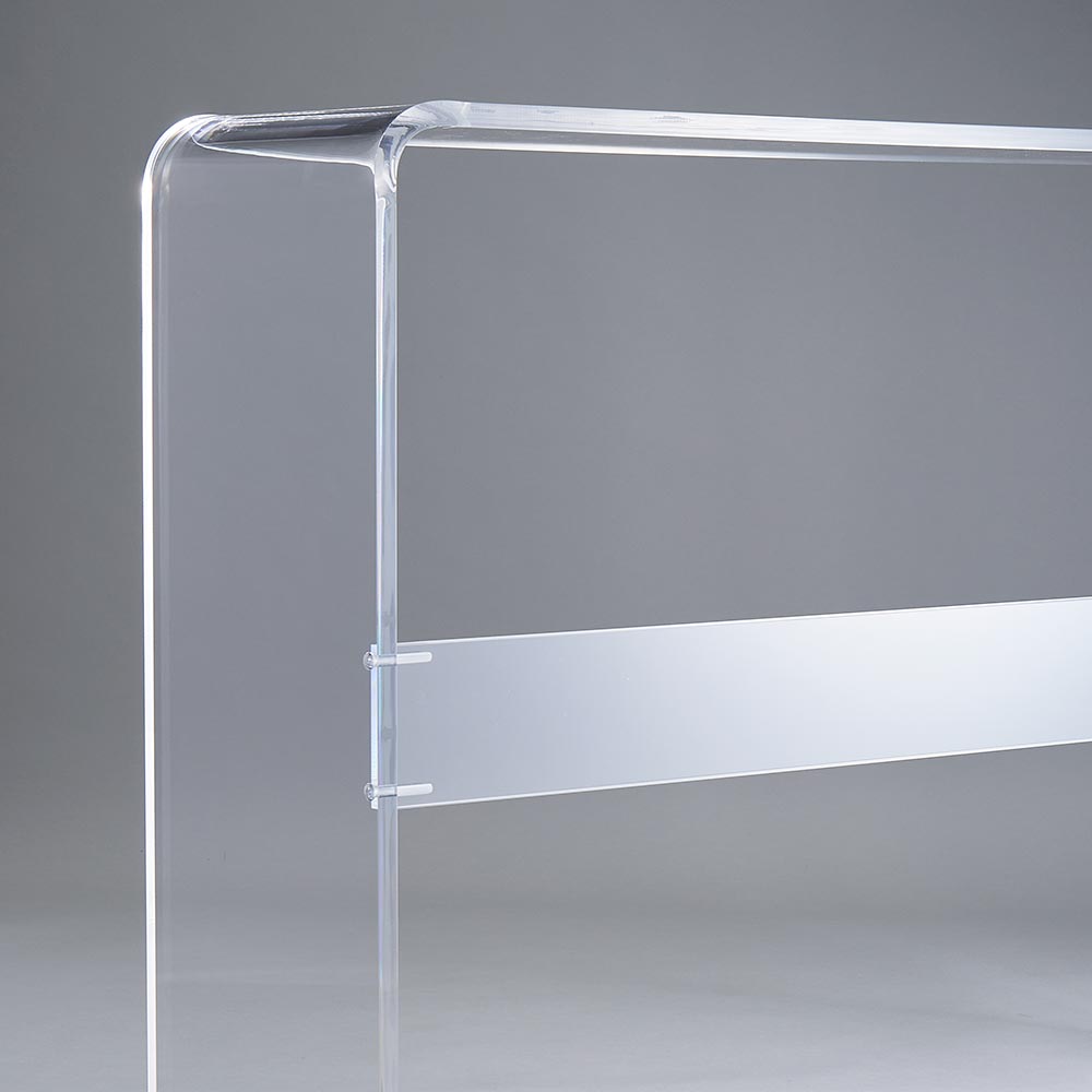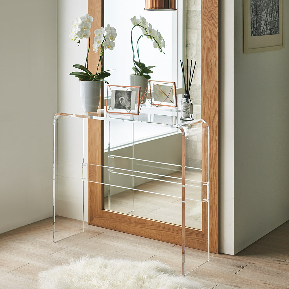 厚みのあるアクリルを贅沢に使用。余裕のない空間にも広がりと輝きを与えるクリアな素材で狭い廊下や玄関などもあっという間におしゃれに。シンプルなデザインで、ドレッサー代わりやディスプレイラックとしても。インテリアを損なわず、すっきりと美しい空間を演出。透明な輝きが美しい、おしゃれなアクリルコンソールテーブル■たっぷり15mmの厚みのあるアクリルを使用して作った、シンプルなコンソールテーブル。■一枚のアクリルを曲げることで可能な限りシンプルな形に。■無駄のないシルエットが、透き通るような美しさをより際立たせます。圧迫感を感じさせないデザインで、廊下や玄関、狭いお部屋にもぴったり。■本体奥行きは25cmととてもスリム。廊下や玄関、リビングのデッドスペースに。■クリア素材なので、見た目にも圧迫感が軽減され、すっきりとした印象に。シンプルな形でも使い方いろいろ。ドレッサーにも、ディスプレイラックにも。■完全クリアなので、壁にかけた姿見の真ん前においても便利。■クリアコンソールの上を簡易ドレッサーとしてお使いいただけます。■クリアな見た目で、存在感を感じさせないたたずまいが、ディスプレイスペースとしてもお勧め。■お気に入りのオブジェや時計、フォトフレームなどをまとめてデコレーションも素敵。簡単組立ですぐにお使いいただけます。■背面の補強用のアクリル板をネジで止めるだけの簡単組立。すぐにお使いいただけます。■ネジも透明なアクリル製で、美しさを損なわないようこだわりました。