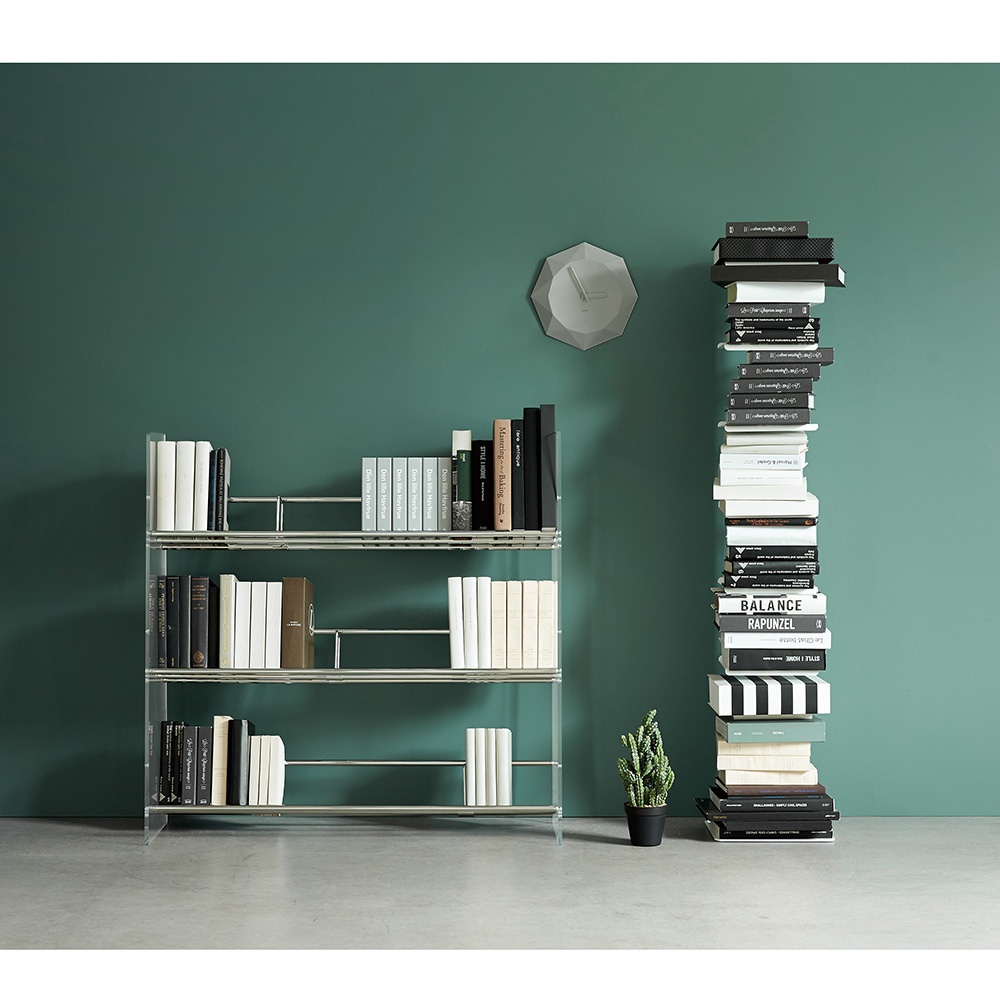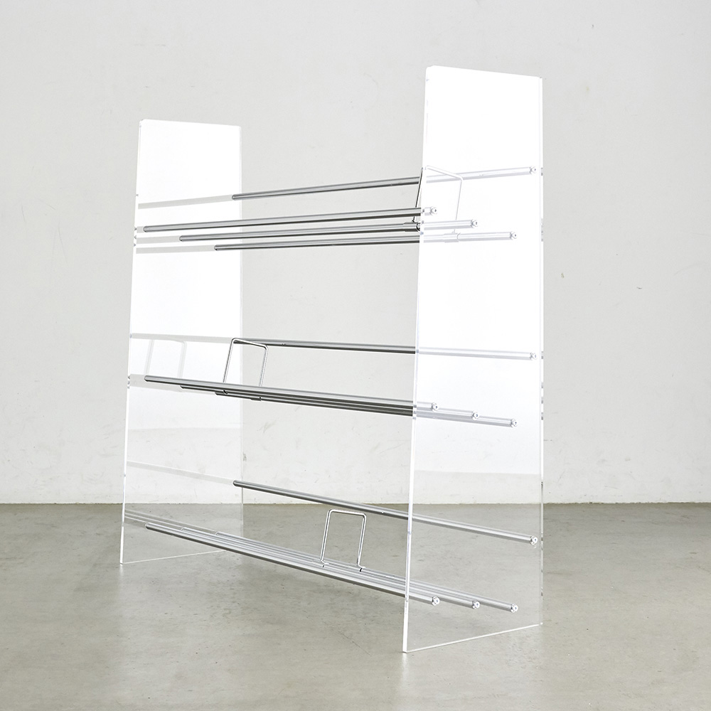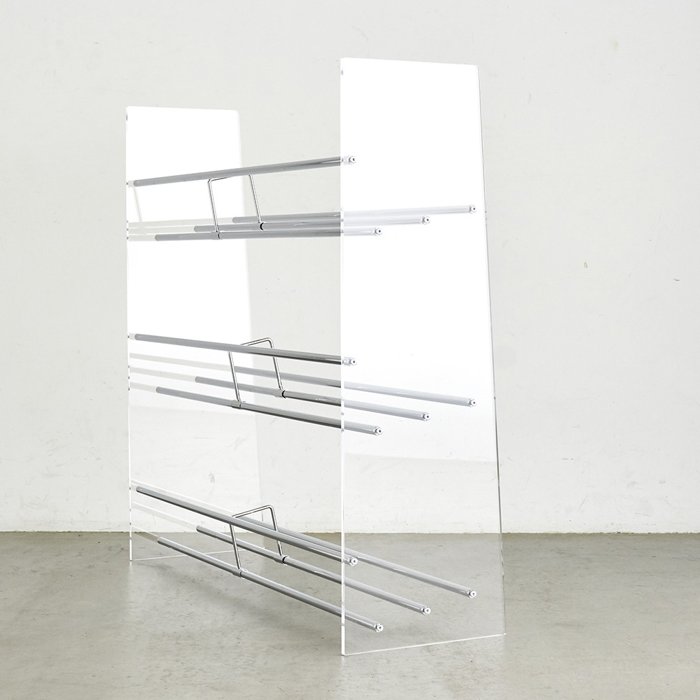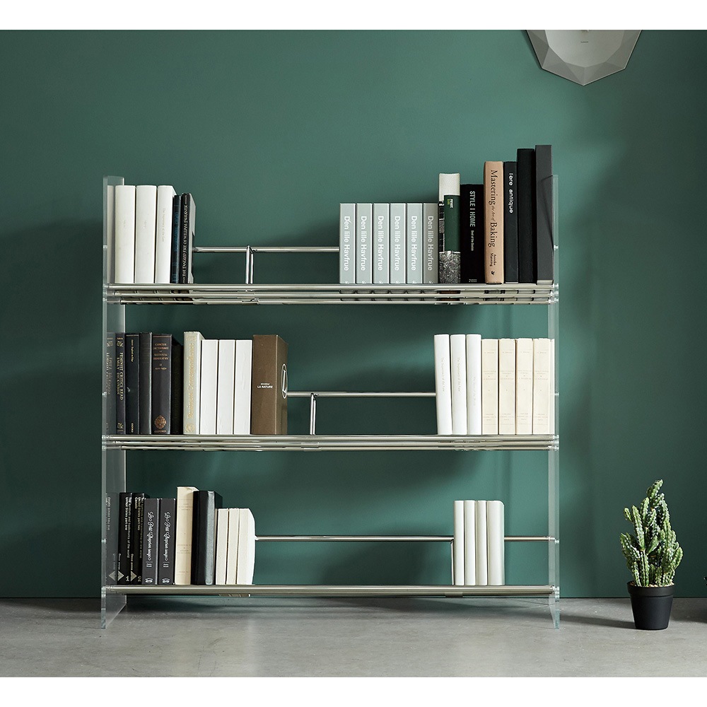 存在感を消すことに美しさを求めた、新感覚の収納スタイル。傾斜が付いた棚は、収納物を出し入れしやすく、浮遊感も際立たせます。存在感がないことの美しさ主張をしない。無駄がない。研ぎ澄ませた末に生まれる美しさがありました。本体は、クリアーアクリルとスチールパイプのみの、極めてシンプルな造り。透き通った佇まいに、収納物の浮遊感も感じられる、新しい収納スタイルの登場です。散らかりがちなブック類に、センスが光る収納を。〜素材と機能〜◆側板には透明感が美しい、10mm厚のアクリルを採用。高相性のスチールとの融合で、独自性の高いオシャレな本棚に仕上がりました。◆本体と棚がナナメに傾斜しているため、スムーズに出し入れすることが可能です。◆文庫本・CD・DVD・A4雑誌まで、幅広く対応。可動式のブックエンド付きで、しっかりと固定します。◆頑丈なスチールパイプを使用しており、高い収納性を誇ります。◆スチールパイプを側板に接合するだけの、簡単組立商品です。〜用途と利用場面〜◆デスクサイドでの本類・書類収納のための、ロータイプのブックシェルフとして。◆リビングやソファサイドでの、ちょっとしたブックラックとしてもオススメ。◆窓下収納としても活躍できる高さ設計です。◆CDラック・DVDラック・コミックラックとして、オシャレなデザインをお楽しみください。