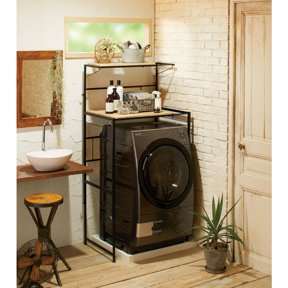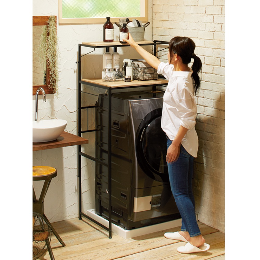 天然木調の棚板とざらっとマットな質感のフレームを組み合わせた、男前なデザイン。ニューヨークのようなブルックリンインテリアが好きという方におすすめです。また 「本体幅・棚の高さ・左右の脚の長さ」がそれぞれ調節でき、段差や窓があっても場所に合わせた設置が可能。見映えも使い勝手もよいラックで、洗濯機回りがおしゃれに生まれ変わります。※当商品は、洗濯機を動かさずにラックを設置可能です。ブルックリンテイストを取り入れたカフェスタイル●インダストリアルとナチュラルが調和したおしゃれな洗濯機ラック。●流行のヴィンテージ風や男前インテリア、ボタニカルインテリアとの相性もよいデザインです。●棚板はリアルな木目の風合いがある化粧板。汚れが拭き取りやすい素材です。●フレームはアイアン調のざらつきのあるマットな質感です。●下段の棚板は奥行53cmで、洗剤ボトルやバスタオルなどがたっぷり置ける広さです。幅伸縮・棚調節ができて、使い勝手のよいつくり●「本体幅の伸縮」「棚の高さ調整」「脚の高さ調節」で、場所に合わせた設置ができます。●幅が68〜88cmに伸縮し、ご自宅の洗濯機置き場に合わせて調節できます。●高さは約143〜193cmに調整可能。窓や梁を避けて低めの設置もできます。●棚板は収納物に合わせて高さ調節可能なので、水道の蛇口やコンセントを避けての設定もできます。●棚板を手の届きやすい高さに設定できる便利な洗濯用品入れ。高い段差や防水パンもまたいで設置できる●脚の長さが左右それぞれに変えられるため、床に段差がある脱衣所や洗面所でも使用できます。●壁付けの防水パンでも、脚の高さを左右で変えて設置することができます。●脚には微調整できるアジャスターが付いているので、床に段差があってもがたつきなく使うことができます。●調整方法はツマミをまわして固定するだけの簡単構造です。