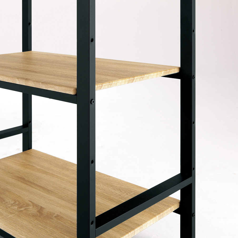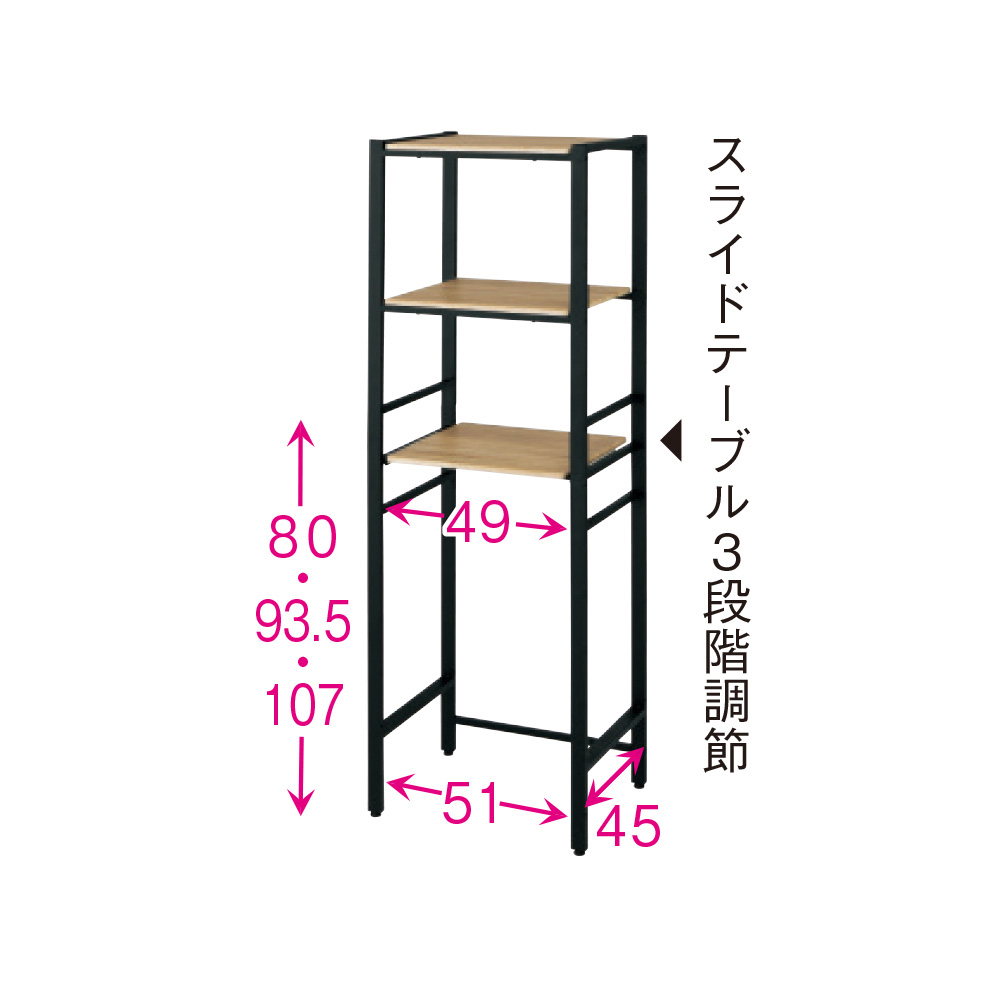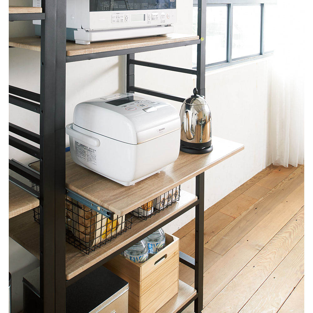 魅せる収納が楽しめるオープン棚で、生活感まで絵になるキッチンラック。天然木調の棚板とアイアン調のマットなスチールのフレームが調和したトレンドのインダストリアルデザインがポイント。シンプルナチュラルなインテリアにちょっと辛口なニューヨークのブルックリンスタイルのテイストがハンサムなスパイスになります。キッチンを洗練された雰囲気にしたい方におすすめ。コーディネート例:ホワイト(お届けは写真左の3段 幅60cmタイプ)洗練されたキッチンを演出する、ブルックリンスタイルの収納棚キッチン家電や調理器具を飾るように収納できる収納ラックです。天然木調の棚板とアイアン調のスチールのフレームが調和した、人気のインダストリアルデザイン。ナチュラルインテリアのアクセントにもなり、男前インテリアやヴィンテージ風インテリアとの相性も抜群!キッチンをおしゃれに演出します。ブラック 3段 幅60cmタイプ(お届け商品)※赤字は内寸(単位:cm)デザインと機能性を兼ね備えた収納ラックスライドテーブルや高さ調節できる棚など、収納ラックとしての使いやすさにもこだわりました。棚の奥行(有効内寸)は45cmあり、キッチン家電を置いても余裕があります。使用例:ホワイト(3段 幅80cmタイプ)棚板は耐荷重約20kgの頑丈仕様電子レンジや炊飯器などをおしゃれに魅せながら、ひとつの棚にまとめて収納できます。コーディネート例:ブラック(左:3段 幅80cmタイプ、右:5段 幅80cmタイプ)選べる4タイプ収納するものやご自宅のスペースに合わせて、ちょうどよいサイズを選べます。棚板は3段・5段の2タイプ、幅は60cm・80cmの2タイプ、計4タイプをご用意しています。3段タイプは、下にダストボックス(ゴミ箱)など高さがあるものを収納するのに便利です。5段タイプは、家電や食材のストックなど、収納物のサイズや種類に合わせて効率よく収納できます。使う時だけ引き出せる、調整可能なスライドテーブルスライドテーブルは、取り付け高さが3段階から選べます。蒸気が出る炊飯器なども使いやすい作りです。耐荷重は約10kg。高さ調節可能、手入れも簡単な棚板棚板はすべて、14cm間隔で取り付け位置を選べます。組み立て時に、収納したい物に合わせて調整可能です。また、棚板は化粧仕上げなので、汚れもラクに拭き取れます。マットな質感のフレームでクールな印象にフレームにはザラつきのあるマットな質感のスチール製長角パイプを使い、クールな印象に仕上げています。高さは微調整できて安定感あり!脚部のアジャスターで高さの微調整が可能。がたつきもなく安定して設置できます。転倒防止の金具付き。