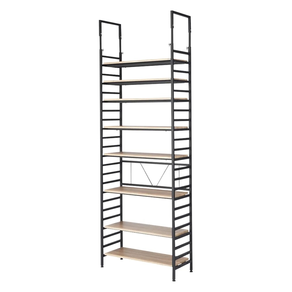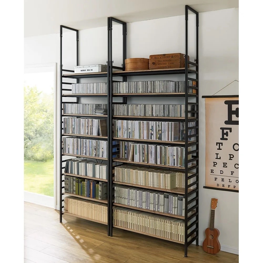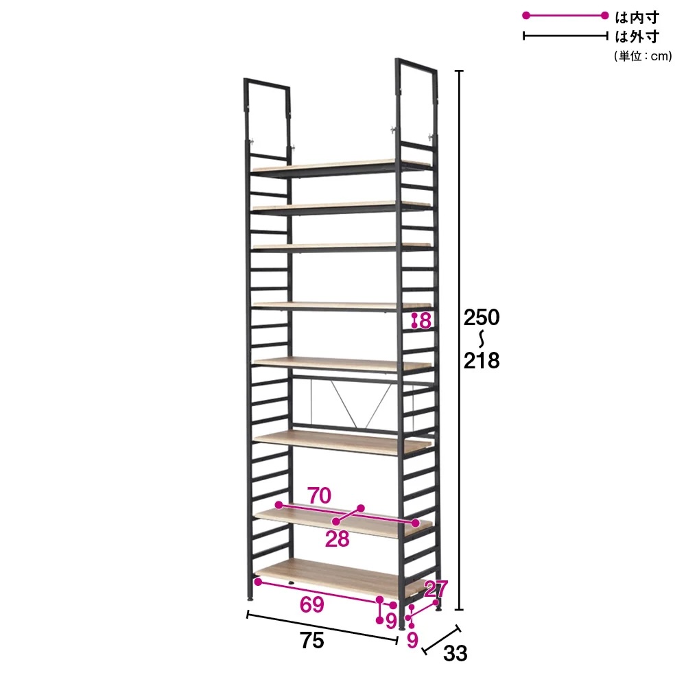 本商品は「ブルックリンテイスト頑丈突っ張りラック 幅75cm奥行33cm高さ218~250cm」です。辛口ルックスの突っ張りラック。本やオーディオ、インテリアグリーンなど、壁一面にお気に入りをディスプレイ。インテリアスタイルにこだわった、ブルックリンスタイルの壁面ラックです。重厚な見た目と確かな頑丈設計ブラックスチールとウッドの組み合わせがモダンな人気の頑丈ラック!突っ張り部分のデザインなどディテールにもこだわった逸品。大量収納に耐え得る頑丈仕様で、長く使える収納ラックです。選べる奥行サイズ奥行23cm コミック・CD・小物のディスプレイに!圧迫感の無い薄型サイズ。奥行内寸18cmの棚板にはコミックや文庫本、CDの収納として便利。壁面を生かした薄型のディスプレイスペースとしても活躍。選べる奥行サイズ奥行33cm雑誌やA4ファイルボックスが納まる奥行内寸28cmの棚板。書類以外にもキャンプグッズを収納したり、玄関でシューズラックとして使用したり、幅広い用途でお使いいただけます。選べる奥行サイズ奥行43cmアンプ、スピーカー等の音響家電やリビング家電までも納まる深型サイズ。奥行内寸38cmの棚板にはレコードなども納まります。衣類の収納にもおすすめです。大量収納を支える耐荷重20kgの頑丈棚板2本の角パイプの上に棚が乗っている頑丈仕様。サイドのフレームにしっかり固定できます。安定感のある突っ張り構造天井に突っ張る構造なので安定感があり、壁一面を収納としてフル活用出来ます。耐震対策としても突っ張り構造は安心材料のひとつです。機能だけでなく、見た目にもこだわった突っ張りデザインを採用しました。効率良く収納できる可動棚仕様棚板は全て8cm間隔で可動出来るので、収納物に合わせて高さ設定できます。サイドラダーも収納として活用サイドラダーに自前のフックを取り付ければ、トートバッグや帽子、鍵など吊り下げて収納としても活用出来ます。