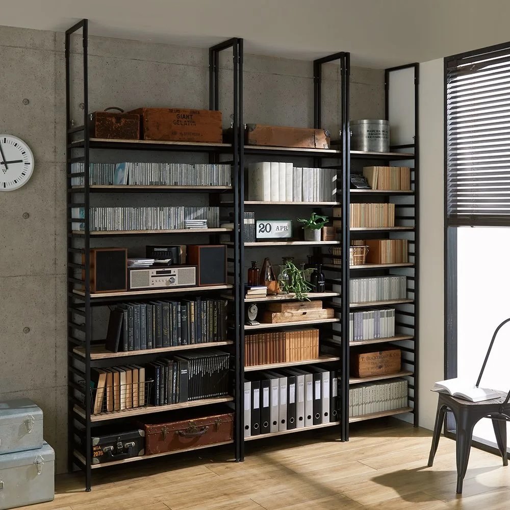 スチールと木目棚板の異素材ミックスと2色使いで、ちょっと辛口のインダストリアルな雰囲気を演出。