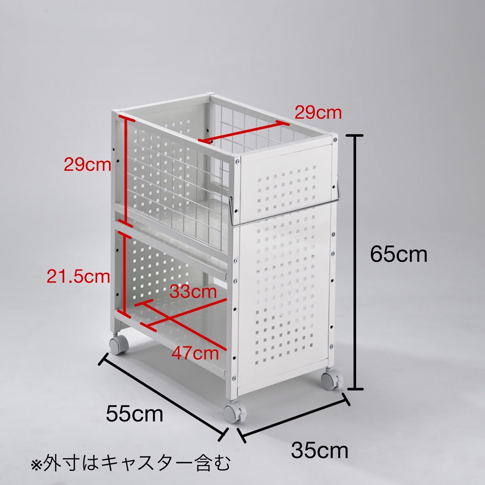クローゼット収納に大活躍。ずっしり入れても出し入れがスムーズにできる頑丈ワゴン。奥行は3サイズあり、押し入れで使いやすいタイプもご用意。置き場所に応じて選べます。コーディネート例 左)幅35cm奥行55cmタイプ(お届け商品) 右)幅45cm奥行55cmタイプ大容量でもスムーズ!頑丈クローゼットワゴンクローゼット収納に大活躍。ずっしり入れても出し入れがスムーズにできる頑丈ワゴン。幅35cm奥行55cmタイプ(お届け商品)クローゼットにぴったりの奥行55cm奥行55cm(キャスター含む最大サイズ)でクローゼットにぴったり。クローゼット内の整理に、また部屋置きして、出しっ放しのこまごましたものの片付け場所としても便利です。幅45cm奥行75cmタイプ耐荷重20kgで重い物も安心収納棚板1枚あたりの耐荷重約20kgの頑丈設計。ミシンやアイロンなどの重いものの収納にもぴったり!幅45cm奥行65cmタイプ扇風機などの背高アイテムも簡単出し入れ上段は上から出し入れできるので扇風機など背が高いものも入れられ、立ったまま出し入れできます。左から幅45cm奥行75cmタイプ、幅35cm奥行75cmタイプ、幅35cm奥行65cmタイプ雑貨も日用品も一気に整理!バッグやおもちゃ、雑貨など、形が不揃いで整理しにくいものの収納にも便利です。下段は書籍や雑誌、ソーイングボックス、ティッシュペーパーの箱など日用品のストックなどに便利です。左)幅35cm奥行75cmタイプ収納場所に困るモノもひとまとめ防災グッズなど、普段使用しないものもたっぷり収納できます。左)幅35cm奥行55cmタイプ(お届け商品) 右)幅45cm奥行75cmタイプメッシュ側板で落下防止!棚板の高さ調整も可側面は収納物の落下を防ぐ可動式のメッシュの側板付き。探しやすく、必要なものがサッと取り出せます。棚板は上段、下段とも収納物に合わせて高さ調節できます。キャスター付きで楽々移動と固定キャスター付きなので、収納したまま必要なものを出したいときもラクに引き出せます。掃除機など、毎日頻繁に出し入れするものを収納しても便利です。キャスター4個のうち2個はストッパー付きです。幅35cm奥行55cmタイプ(お届け商品)6種類から選べる最適なサイズ奥行は55cm、65cm、75cmの3サイズ、幅は35cm、45cmの2サイズ、計6種類(キャスター含む最大サイズ)から選べます。クローゼットや押し入れ下段で使いやすいサイズを揃えました。単体で使っても、2台を並べて使っても便利です。
