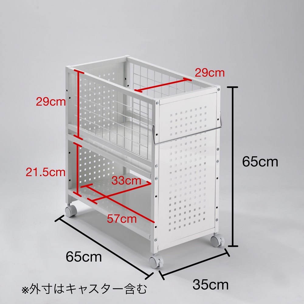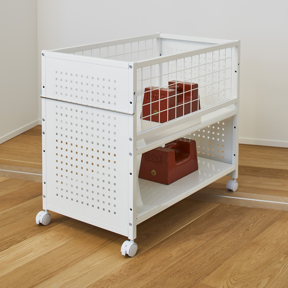 押し入れ収納に大活躍。ずっしり入れても出し入れがスムーズにできる頑丈ワゴン。奥行は3サイズあり、クローゼットで使いやすいタイプもご用意。置き場所に応じて選べます。幅35cm奥行65cmタイプ(お届け商品)大容量でもスムーズ!頑丈押し入れ収納ワゴン押し入れ収納に大活躍。ずっしり入れても出し入れがスムーズにできる頑丈ワゴン。幅35cm奥行65cmタイプ(お届け商品)押し入れにぴったりの奥行65cm奥行65cm(キャスター含む最大サイズ)は押し入れ収納として使いやすいサイズ。押し入れ下段の整理に、また部屋置きして、出しっ放しのこまごましたものの片付け場所としても便利です。幅45cm奥行75cmタイプ耐荷重20kgで重い物も安心収納棚板1枚あたりの耐荷重約20kgの頑丈設計。ミシンやアイロンなどの重いものの収納にもぴったり!幅45cm奥行65cmタイプ扇風機などの背高アイテムも簡単出し入れ上段は上から出し入れできるので扇風機など背が高いものも入れられ、立ったまま出し入れできます。左から幅45cm奥行75cmタイプ、幅35cm奥行75cmタイプ、幅35cm奥行65cmタイプ(お届け商品)雑貨も日用品も一気に整理!バッグやおもちゃ、雑貨など、形が不揃いで整理しにくいものの収納にも便利です。下段は書籍や雑誌、ソーイングボックス、ティッシュペーパーの箱など日用品のストックなどに便利です。左)幅35cm奥行75cmタイプ収納場所に困るモノもひとまとめ防災グッズなど、普段使用しないものもたっぷり収納できます。左)幅35cm奥行65cmタイプ(お届け商品) 右)幅45cm奥行75cmタイプメッシュ側板で落下防止!棚板の高さ調整も可側面は収納物の落下を防ぐ可動式のメッシュの側板付き。探しやすく、必要なものがサッと取り出せます。棚板は上段、下段とも収納物に合わせて高さ調節できます。キャスター付きで楽々移動と固定キャスター付きなので、収納したまま必要なものを出したいときもラクに引き出せます。掃除機など、毎日頻繁に出し入れするものを収納しても便利です。キャスター4個のうち2個はストッパー付きです。幅35cm奥行65cmタイプ(お届け商品)6種類から選べる最適なサイズ奥行は55cm、65cm、75cmの3サイズ、幅は35cm、45cmの2サイズ、計6種類(キャスター含む最大サイズ)から選べます。クローゼットや押し入れ下段で使いやすいサイズを揃えました。単体で使っても、2台を並べて使っても便利です。