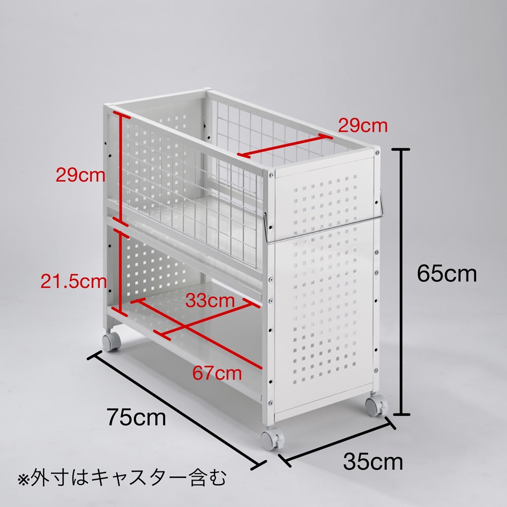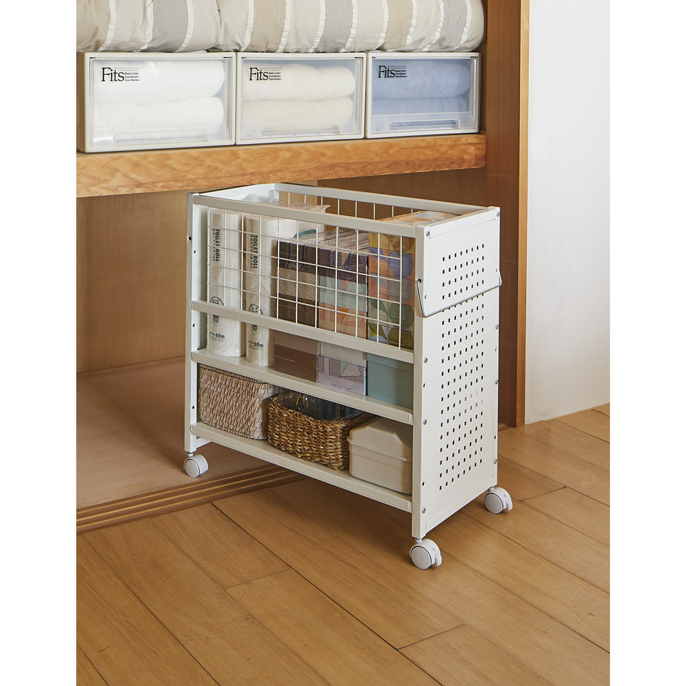押し入れ収納に大活躍。ずっしり入れても出し入れがスムーズにできる頑丈ワゴン。奥行は3サイズあり、クローゼットで使いやすいタイプもご用意。置き場所に応じて選べます。コーディネート例 左)幅45cm奥行75cmタイプ 右)幅35cm奥行75cmタイプ(お届け商品)大容量でもスムーズ!頑丈押し入れ収納ワゴン押し入れ収納に大活躍。ずっしり入れても出し入れがスムーズにできる頑丈ワゴン。幅35cm奥行75cmタイプ(お届け商品)押し入れにぴったりの奥行75cm奥行75cm(キャスター含む最大サイズ)は押し入れ収納として使いやすいサイズ。押し入れ下段の整理に、また部屋置きして、出しっ放しのこまごましたものの片付け場所としても便利です。幅45cm奥行75cmタイプ耐荷重20kgで重い物も安心収納棚板1枚あたりの耐荷重約20kgの頑丈設計。ミシンやアイロンなどの重いものの収納にもぴったり!幅45cm奥行65cmタイプ扇風機などの背高アイテムも簡単出し入れ上段は上から出し入れできるので扇風機など背が高いものも入れられ、立ったまま出し入れできます。左から幅45cm奥行75cmタイプ、幅35cm奥行75cmタイプ(お届け商品)、幅35cm奥行65cmタイプ雑貨も日用品も一気に整理!バッグやおもちゃ、雑貨など、形が不揃いで整理しにくいものの収納にも便利です。下段は書籍や雑誌、ソーイングボックス、ティッシュペーパーの箱など日用品のストックなどに便利です。左)幅35cm奥行75cmタイプ収納場所に困るモノもひとまとめ防災グッズなど、普段使用しないものもたっぷり収納できます。左)幅35cm奥行75cmタイプ(お届け商品) 右)幅45cm奥行75cmタイプメッシュ側板で落下防止!棚板の高さ調整も可側面は収納物の落下を防ぐ可動式のメッシュの側板付き。探しやすく、必要なものがサッと取り出せます。棚板は上段、下段とも収納物に合わせて高さ調節できます。キャスター付きで楽々移動と固定キャスター付きなので、収納したまま必要なものを出したいときもラクに引き出せます。掃除機など、毎日頻繁に出し入れするものを収納しても便利です。キャスター4個のうち2個はストッパー付きです。幅35cm奥行75cmタイプ(お届け商品)6種類から選べる最適なサイズ奥行は55cm、65cm、75cmの3サイズ、幅は35cm、45cmの2サイズ、計6種類(キャスター含む最大サイズ)から選べます。クローゼットや押し入れ下段で使いやすいサイズを揃えました。単体で使っても、2台を並べて使っても便利です。