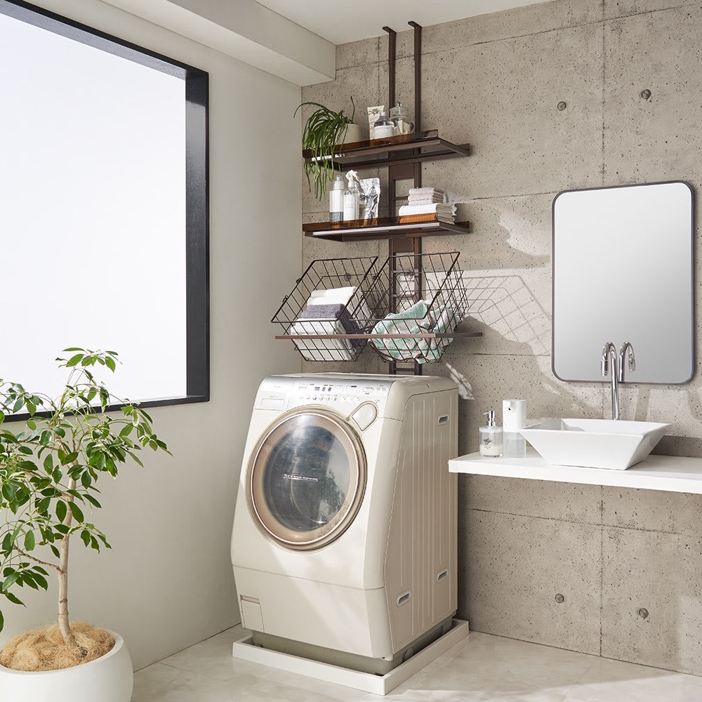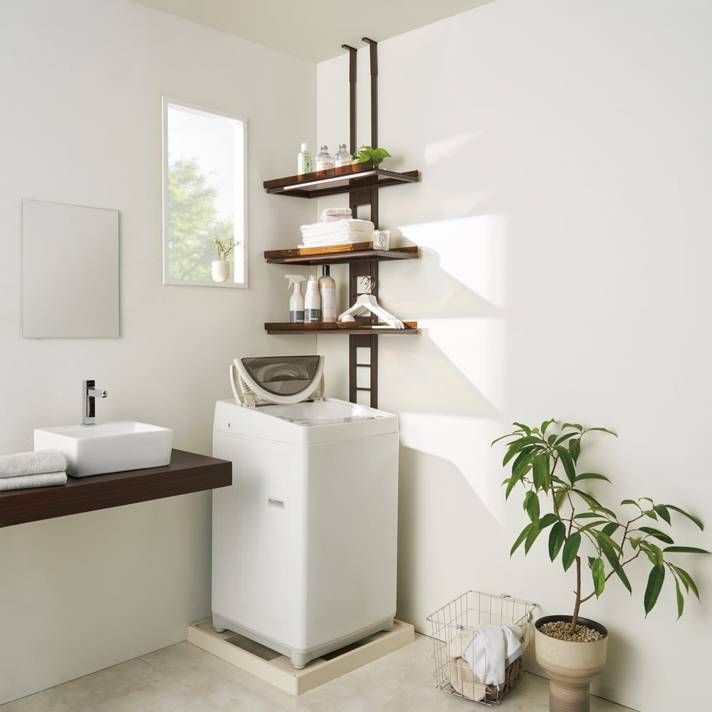 洗濯機を動かさず、支柱を立てて棚を引っ掛けるだけの簡単設置。梁などを避けて設置できます。 ※写真は(イ)ダークブラウンです。