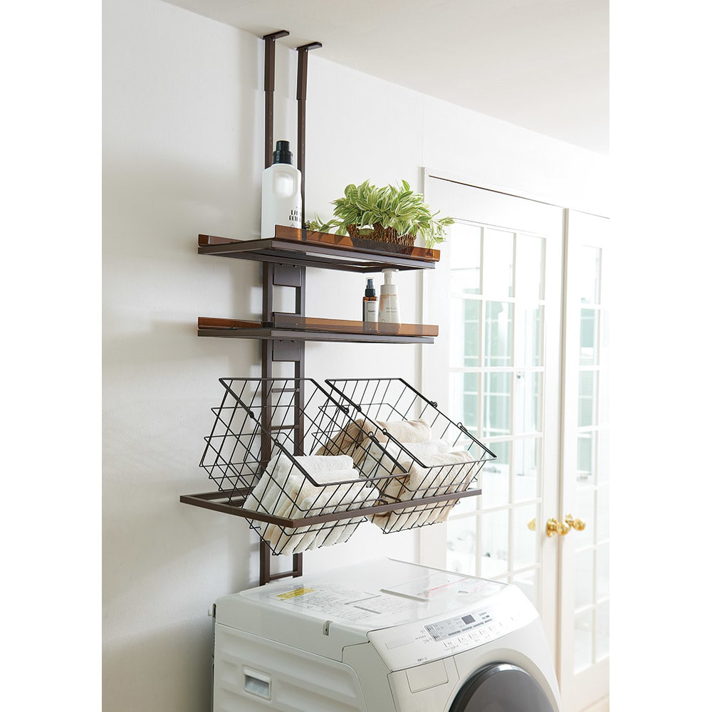 使用イメージ 洗濯機と洗面台の間のわずかなすき間に置けて、棚とカゴは両面に設置できます。 ※写真は別売りのトレー棚1カゴ2個(イ)ダークブラウンです。