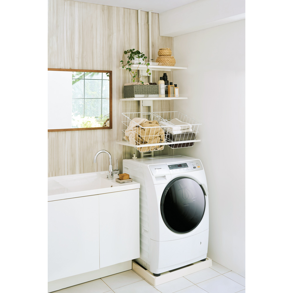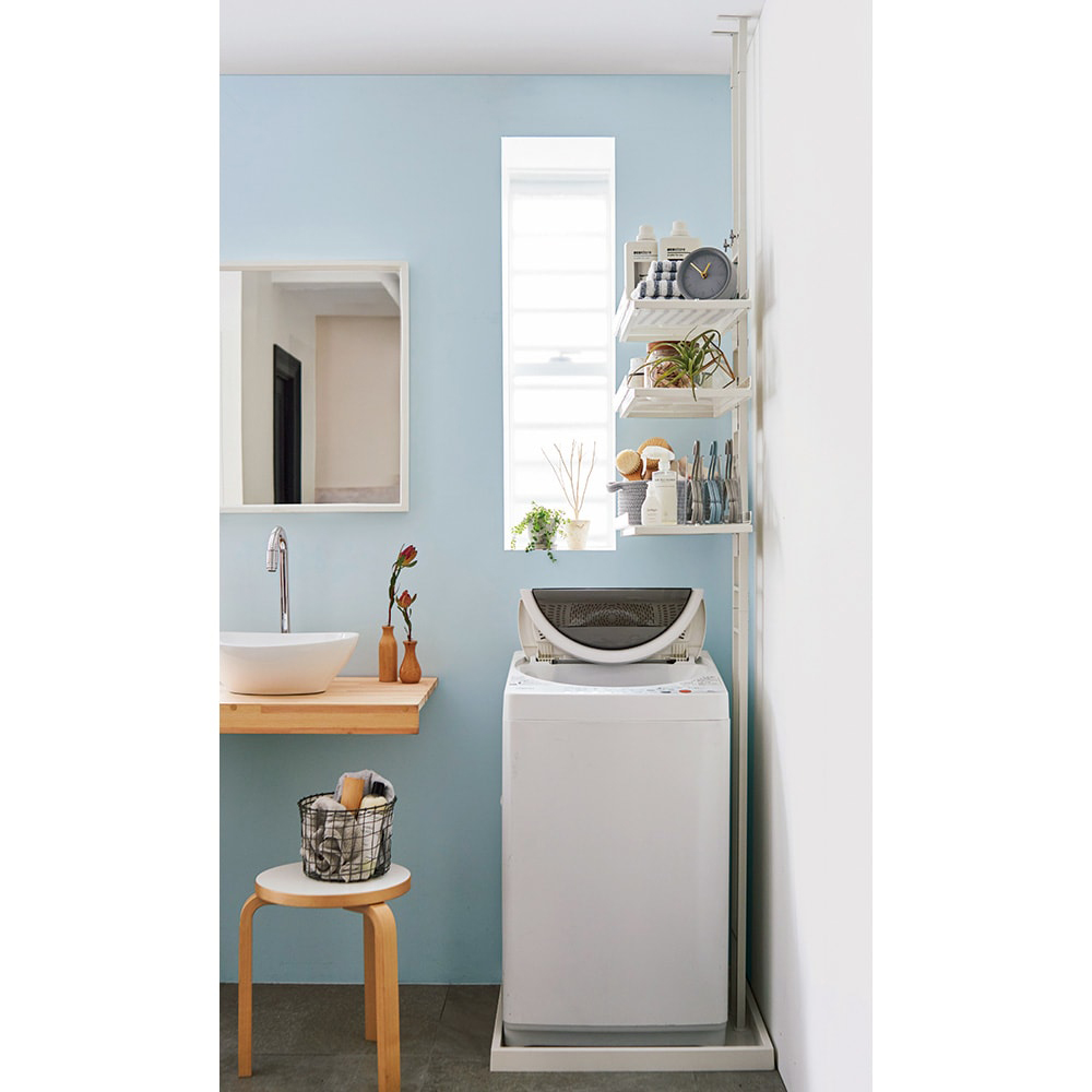 使用イメージ 中心で支えるタイプなので梁などを避けて設置できます。 ※写真は別売りの棚2段バスケット2個(ア)ホワイトです。