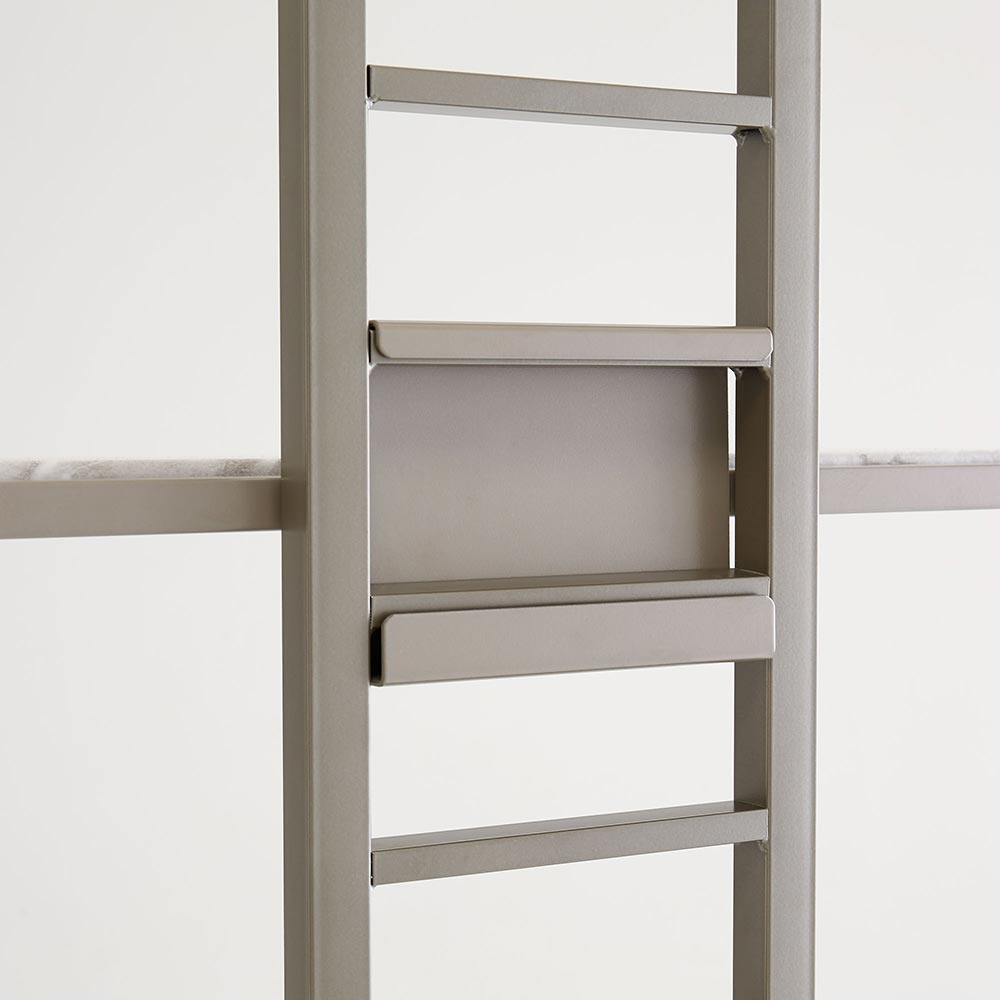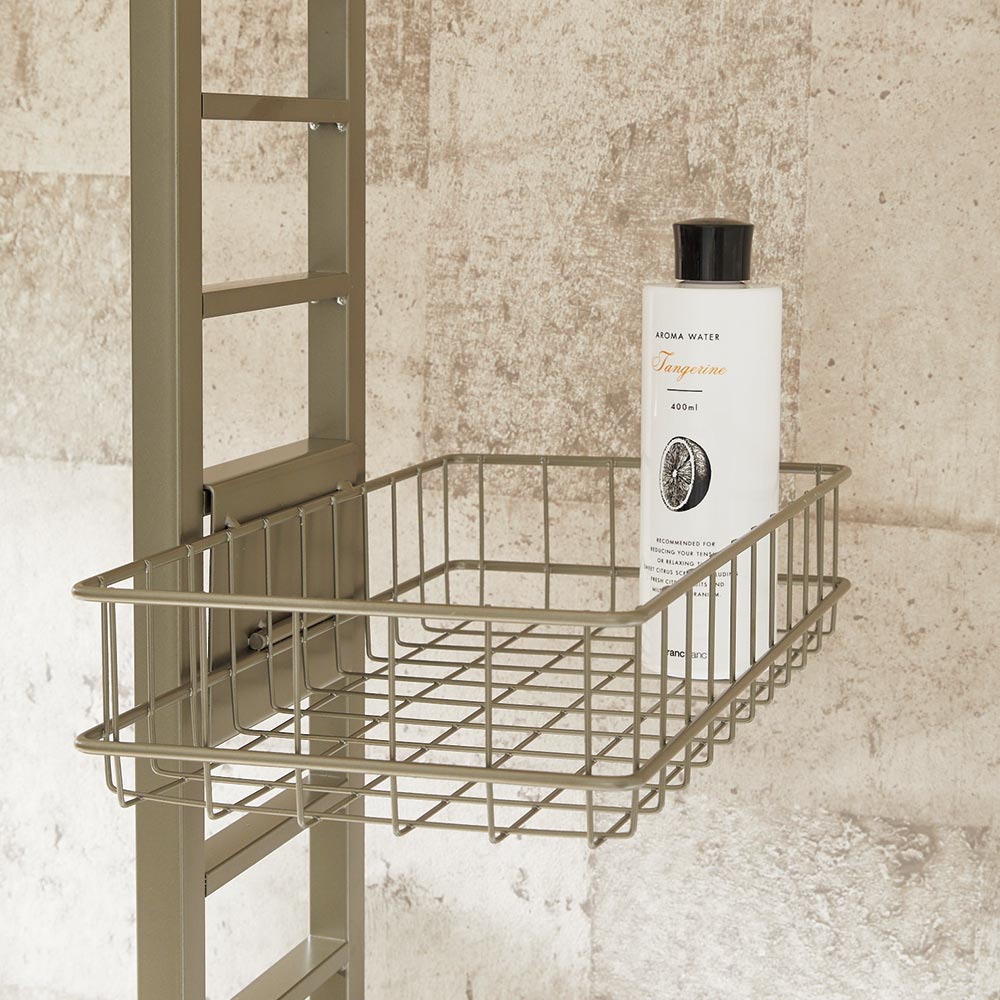 トレー棚1段・カゴ2段タイプ。マットで落ち着いたニュアンスシルバーで仕上げた、ホテルさながらのランドリールームを演出する洗濯機上ラック。安心の天井突っ張り式ランドリーラックです。
