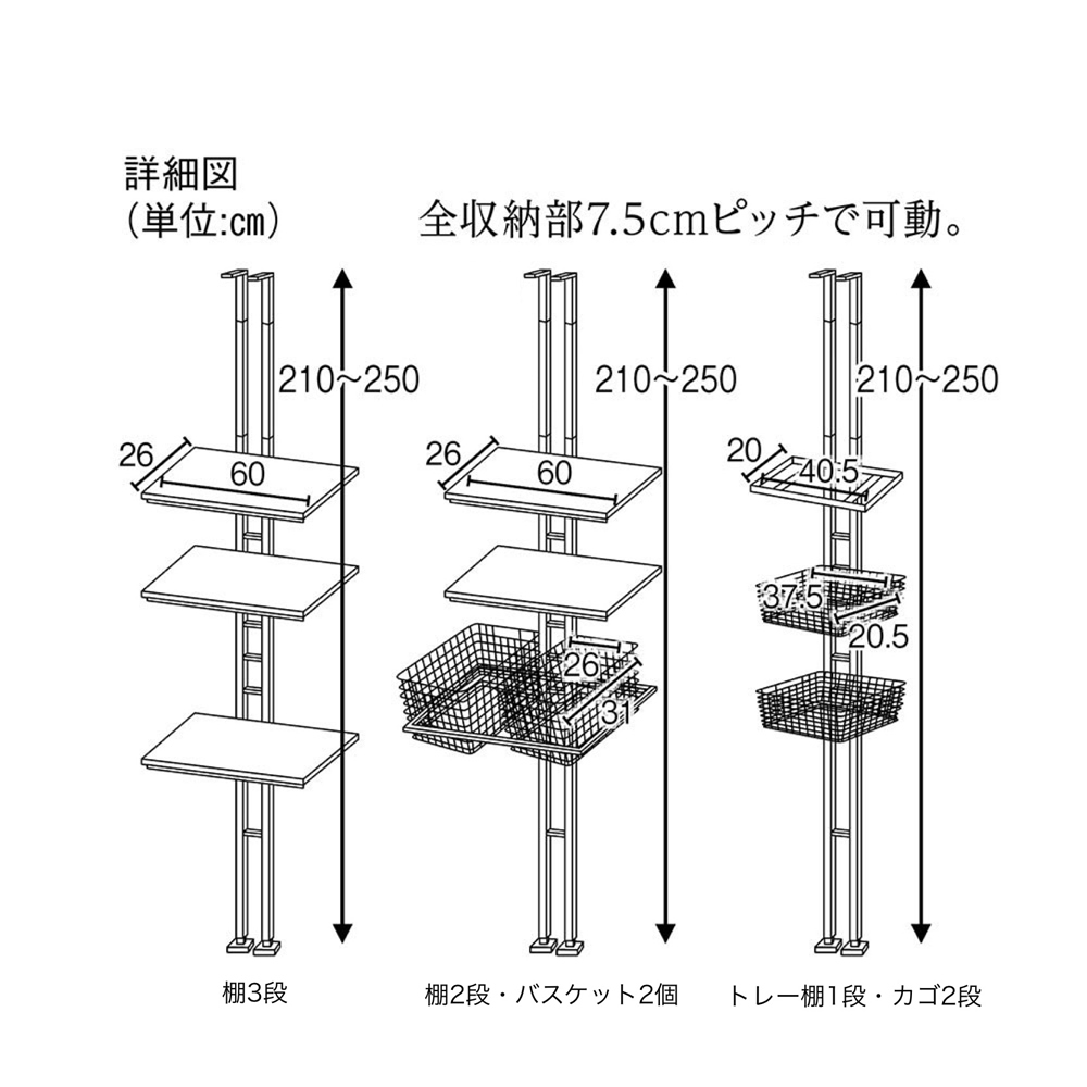 トレー棚1段・カゴ2段タイプ。