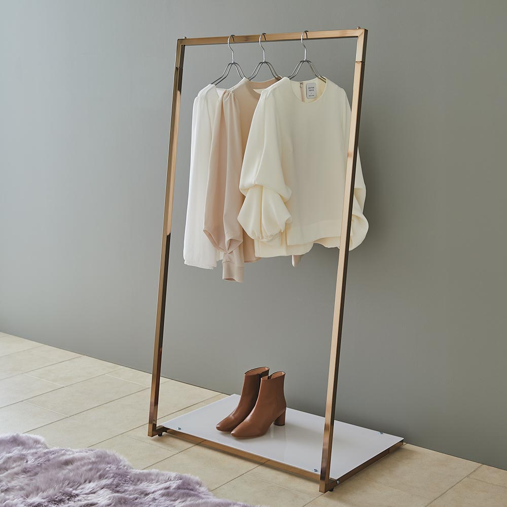 ピンクがかったゴールドカラーがお部屋をラグジュアリーに格上げ。収納するだけでなく、お洋服を選ぶ時間を華やかに演出します。