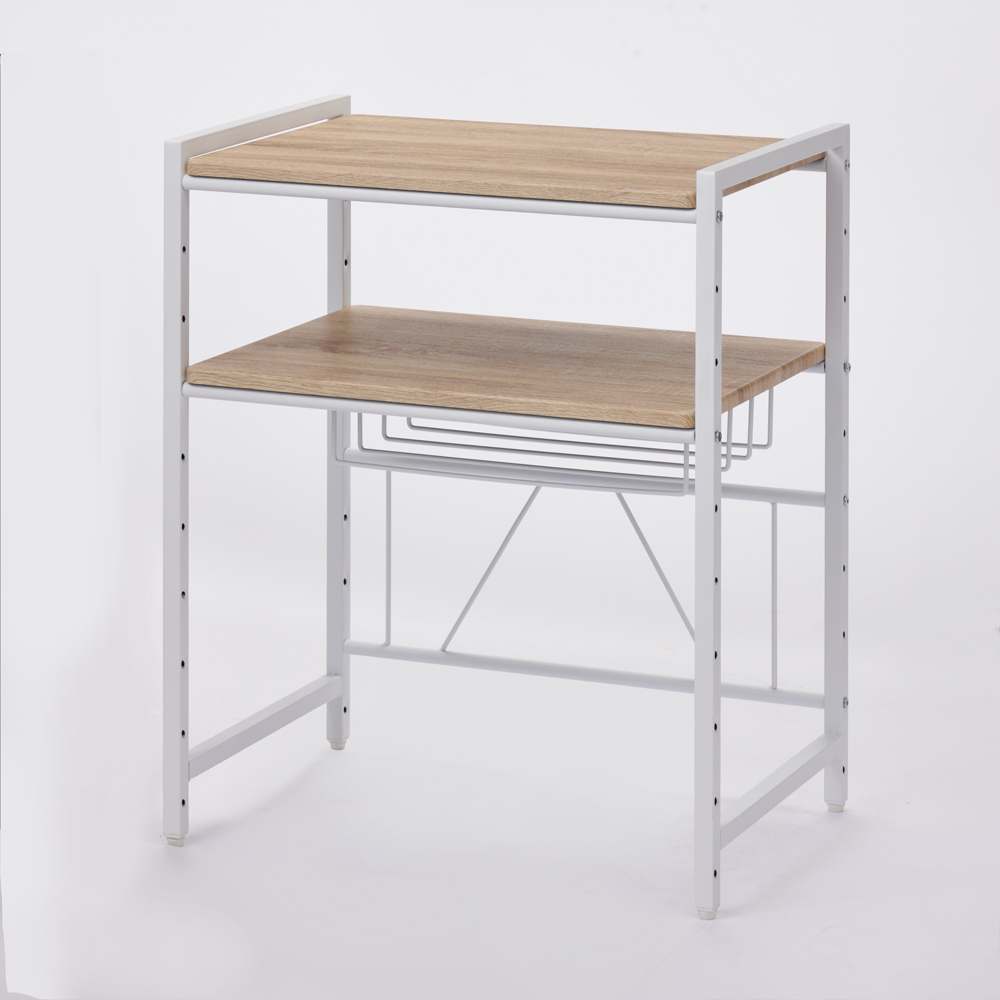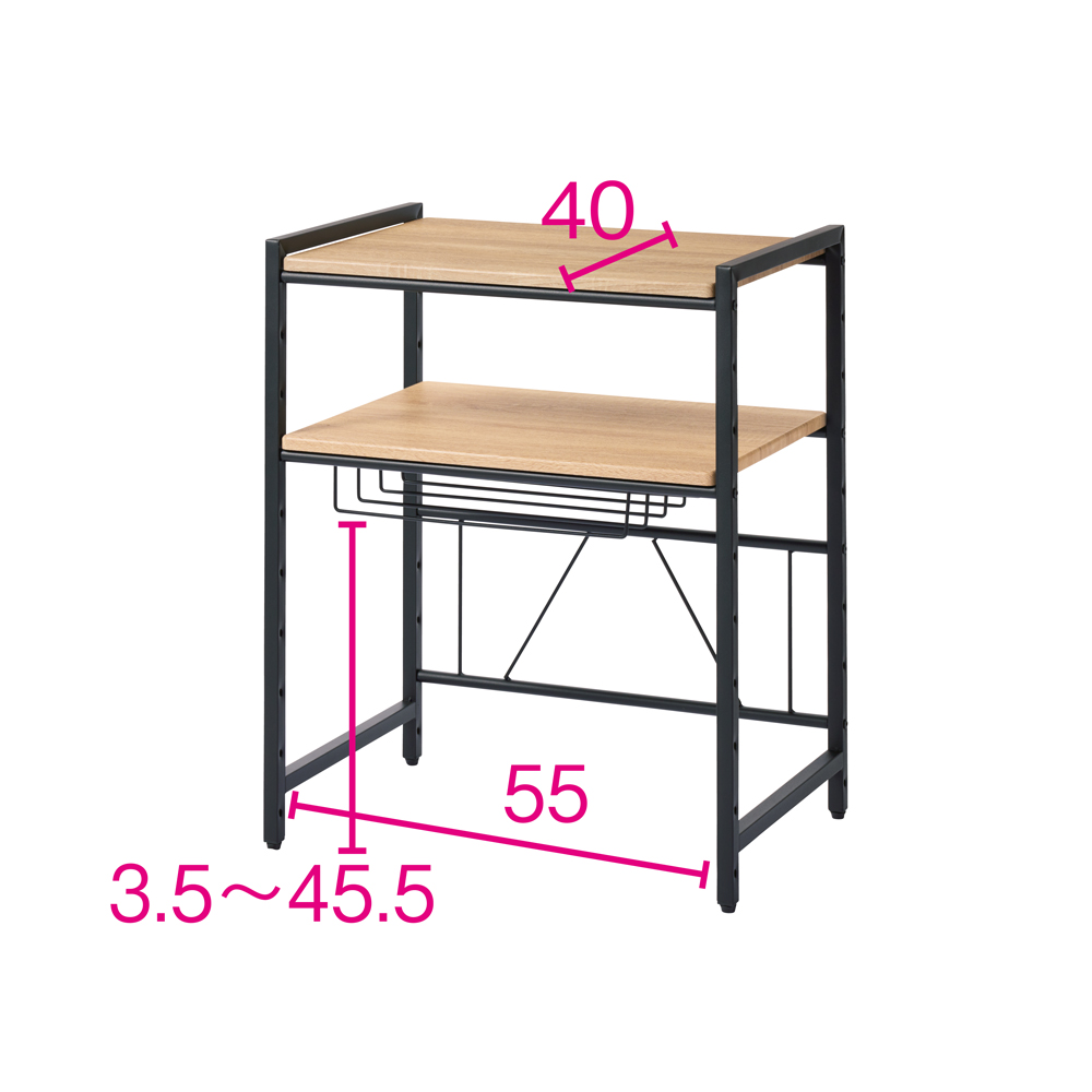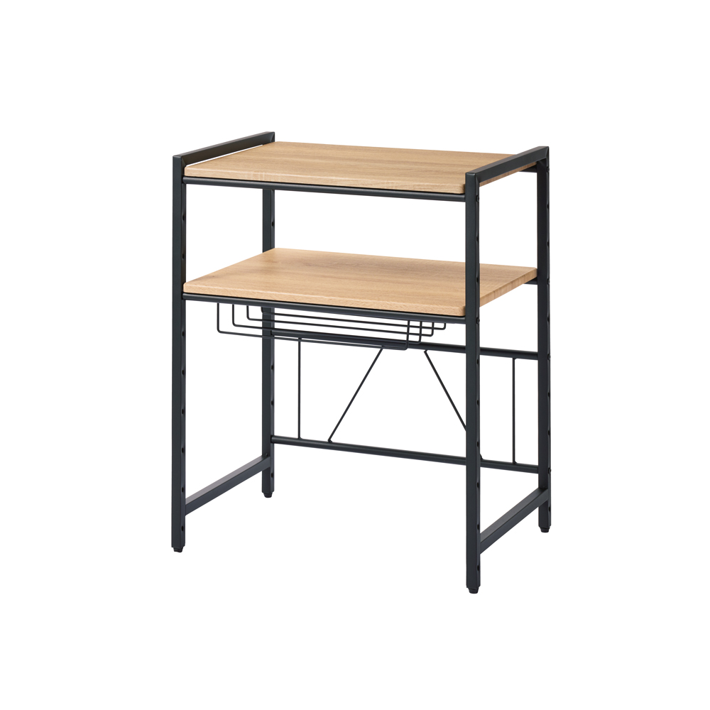天然木柄の棚板とアイアン調のフレームが調和した、ブルックリン風のレンジラック。レンジ上の空間を有効利用でき、おしゃれな調理家電も映えるデザイン。使用例:ホワイト 2段 幅59.5cm(お届け商品)キッチン家電が映えるブルックリン風ラックお気に入りの家電を飾るように収納できるブルックリン風のキッチンラック。ざらっとした質感のスチールフレームに、天然木のような風合いの棚板を組み合わせた男前な外観です。デザイン性の高い調理家電との相性もよく、キッチンが洗練された印象に。見た目も機能も納得のこだわり設計です。お届け商品 ※赤字は内寸(単位cm)棚板2段 幅59.5cmタイプ天板上と中段棚板の上下にたっぷり収納できる2段タイプです。幅59.5cmは、ワイドなトースターや大型レンジにも対応。奥行40cmのため、キッチン家電も余裕を持って配置できます。幅は、59.5cm・84.5cmの2サイズからお選びください。使用例:ブラック 1段 幅84.5cmレンジ上のデッドスペースを有効活用レンジやトースター上を収納スペースとして活用できる棚板付き。調理家電を一か所にまとめることで家事効率もアップ。高さ調節可能な棚板棚板は7cm間隔、10段階に高さ調節できます。小物が収納できる網棚付き棚板下にはラップ類やトレーなどが収納できる網棚付き(内寸サイズ:幅37奥行25高さ7cm)。網棚は左右どちら側にも、使いやすい位置に設定できます。※写真は別売りの棚板1段タイプ重い家電も置ける頑丈仕様棚板耐荷重は約25kg。さらに、背面には補強フレーム付きの頑丈なつくりです。脚部にはアジャスター付きがたつきを抑えて、安定した設置ができます。2段 幅59.5cmタイプ選べる2色展開ホワイトはシンプルナチュラルなインテリアにマッチ。ブラックはおしゃれなキッチンに映えるヴィンテージ風デザイン。どちらも絵になるルックスで、思わずキッチンに立ちたくなるようなスタイリッシュな空間を演出します。
