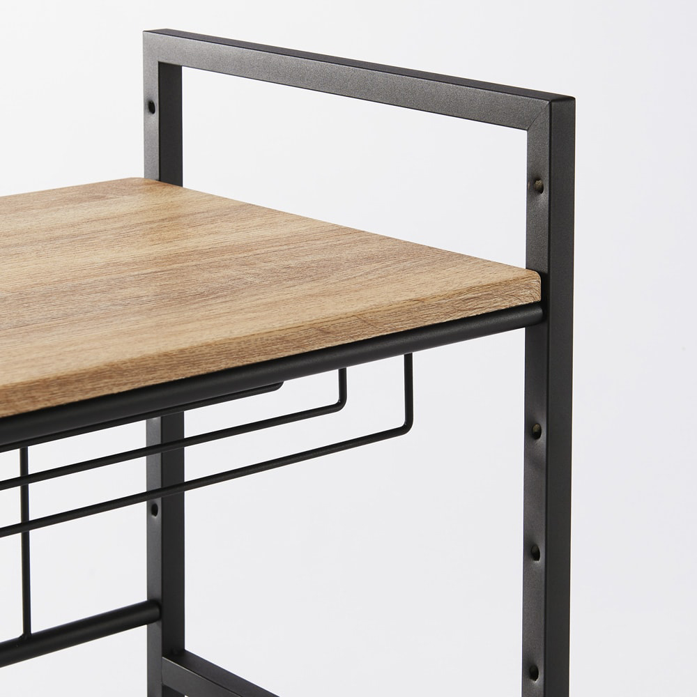 木目柄の棚板とアイアン調のフレーム。棚板は7cm間隔10段階で高さ調節できます。
