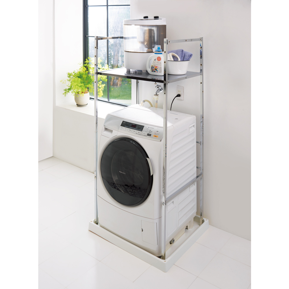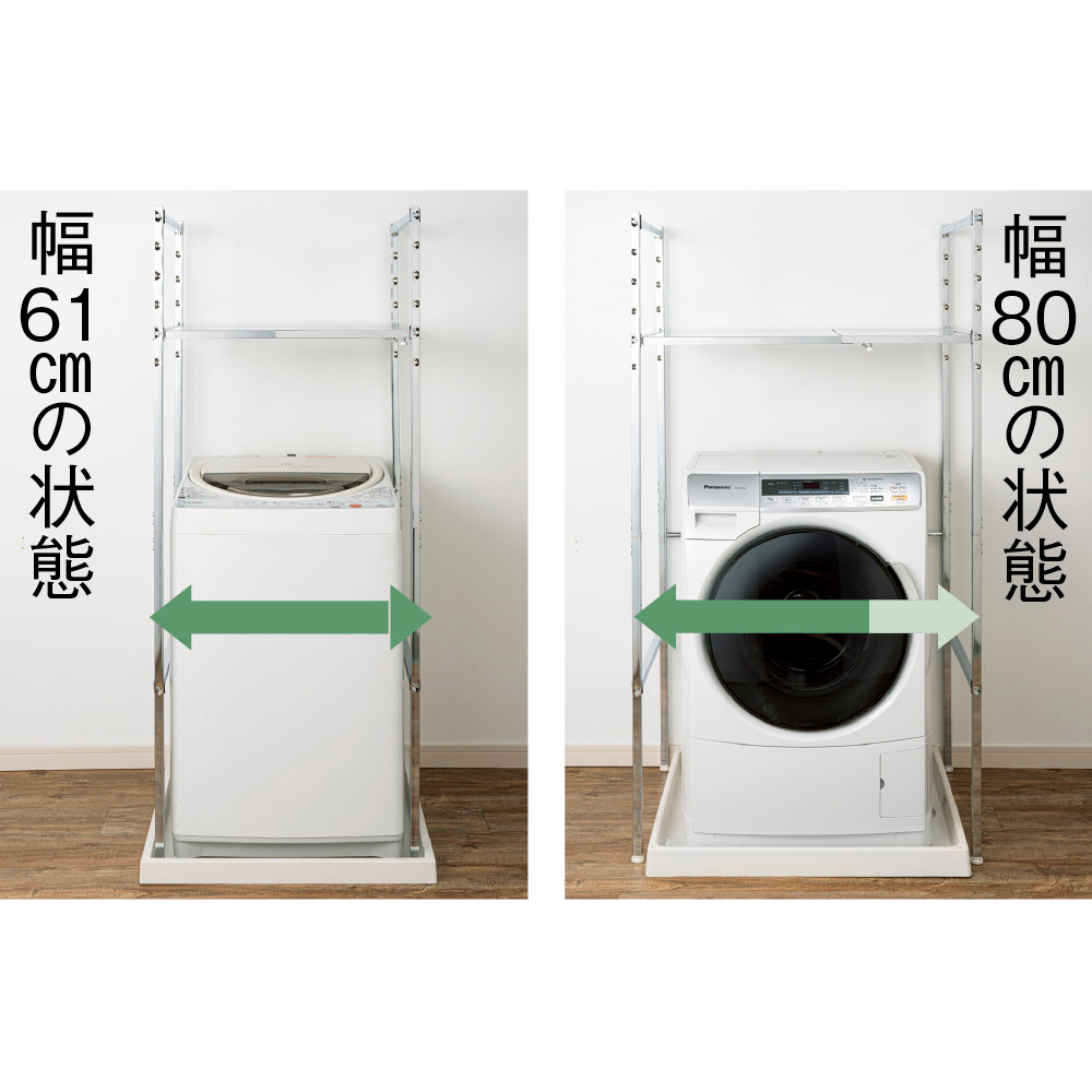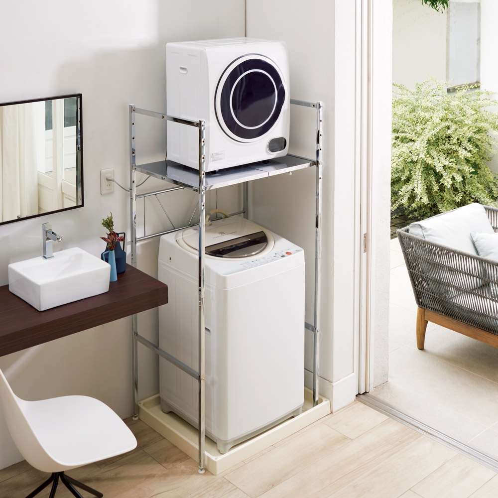 置き場に困る小型衣類乾燥機も安心して置ける、天板耐荷重約25kgの頑丈ラック。洗濯機のすぐ上に衣類乾燥機やミニ洗濯機などが配置できるスタンドなので、流れ作業で使えて家事の時短にも!※当商品は、洗濯機を動かさずにラックを設置可能です。【本商品は想定を大幅に上回る売れ行きにより、在庫なしとなってしまう場合がございます。順次生産・入荷をいたしますので、在庫なしの場合はぜひ、再入荷お知らせ登録をお願いいたします。】「乾燥機をあきらめなくていい」乾燥機スタンドがついに登場スペースがなくて小型衣類乾燥機や洗濯機を置けない方におすすめのランドリーラックです。サイズと仕様にこだわり、洗濯作業のしやすさを追求しました。幅は61cmから80cmまで伸縮し、縦型洗濯機や広めのドラム式にも対応。天板奥行は50cmで、ほとんどの家庭用衣類乾燥機が置ける広さです。濡れた衣類を最短距離で乾燥機にイン!ご自身の身長や設置場所に合わせて出し入れがラクな高さに設定。洗濯機のすぐ上に衣類乾燥機が置けるので、洗濯後の作業が流れ作業となり家事効率が向上します。デッドスペースになりがちな洗濯機の上の空間を有効活用し、すっきりとしたランドリースペースを実現します。「頑丈」にとにかくこだわりました天板の耐荷重は約25kg(耐荷重試験では倍の約50kgをクリア)で、衣類乾燥機や小型洗濯機、靴洗い機などの重量も安心して設置可能です。フレームは2cmの角パイプ、天板下、背面に補強バーを付けて強度をアップ。乾燥機の振動にも安定感があります。洗濯機を動かさずにそのままで設置OK!背面には補強バーが付いており、3段階で高さ調節可能。壁のコンセントや蛇口を避けて簡単に取り付けられます。ラック本体を洗濯機の上からかぶせるようにして取り付けられるので、洗濯機を動かさずにそのままで設置できます。作業台や収納スペースとしても活躍します奥行が50cmのステンレス製天板は錆びにくく、衣類乾燥機を置かない場合は洗剤や洗濯用品がたっぷり収納できます。部分洗いや洗濯物をたたむなどの作業スペースとしても活躍します。