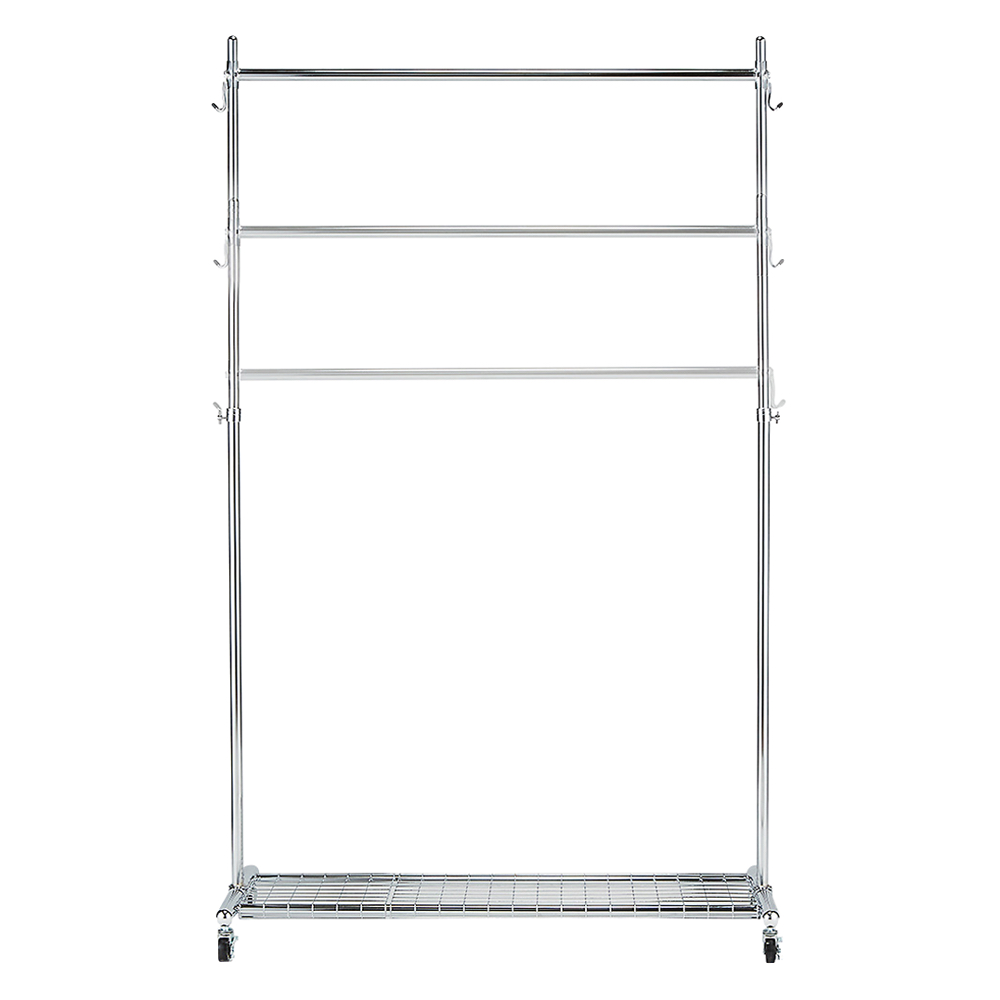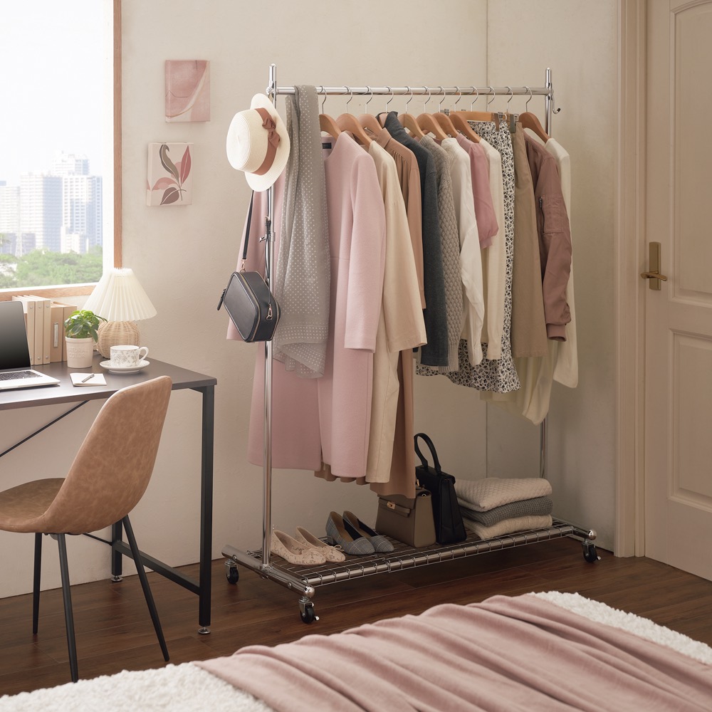 脚元のデッドスペースも有効活用できる棚付き頑丈ハンガーラック。どんなお部屋にも合わせやすいデザイン。移動しやすいキャスター付き。さらにハンガーバーの高さ伸縮もできます。ハンガーでもう失敗したくないという方におすすめ●ディノスのハンガーラックで人気のプロ仕様頑丈ンガーに棚付きタイプが新登場。●足元のデッドスペースを有功活用できる便利な棚には樹脂ケースやカバンなどを置くことができます。●光沢のあるシルバーメッキでインテリアの邪魔をしないシンプルなデザイン。●ベッドルーム、リビングルーム、書斎、クローゼット、衣裳部屋などどんなお部屋にもマッチします。●収納量に応じて幅60・幅90幅120・幅150の4タイプをご用意しました。●ハンガーバー耐荷重50kg、棚耐荷重20kg。肉厚なパイプやスチール製の中間リングが洋服をたくさん掛けてもしっかりと支えます。●冬物の重たい服を掛けるコートハンガーとしてもおすすめです。頑丈キャスター付きで洋服を掛けたままでもラクラク移動ができます●しっかり支えて、移動が楽にできるタフなキャスター付き。●頑丈なキャスター付きで移動もラクラク。掃除など動かすときに役立ちます。●動かす必要のない場合は付属のアジャスターをお使いください。衣類収納だけではなく、雑貨収納にも便利な機能と棚が備わっています●ハンガーバーの有功内寸高さは収納するものに応じて「108〜170cm」に調節が可能です。●バッグ、ベルトやストールが掛けられるサイドフック付きです。●耐荷重約20kgの網棚は収納ケースや鞄などが置くことができ便利です。