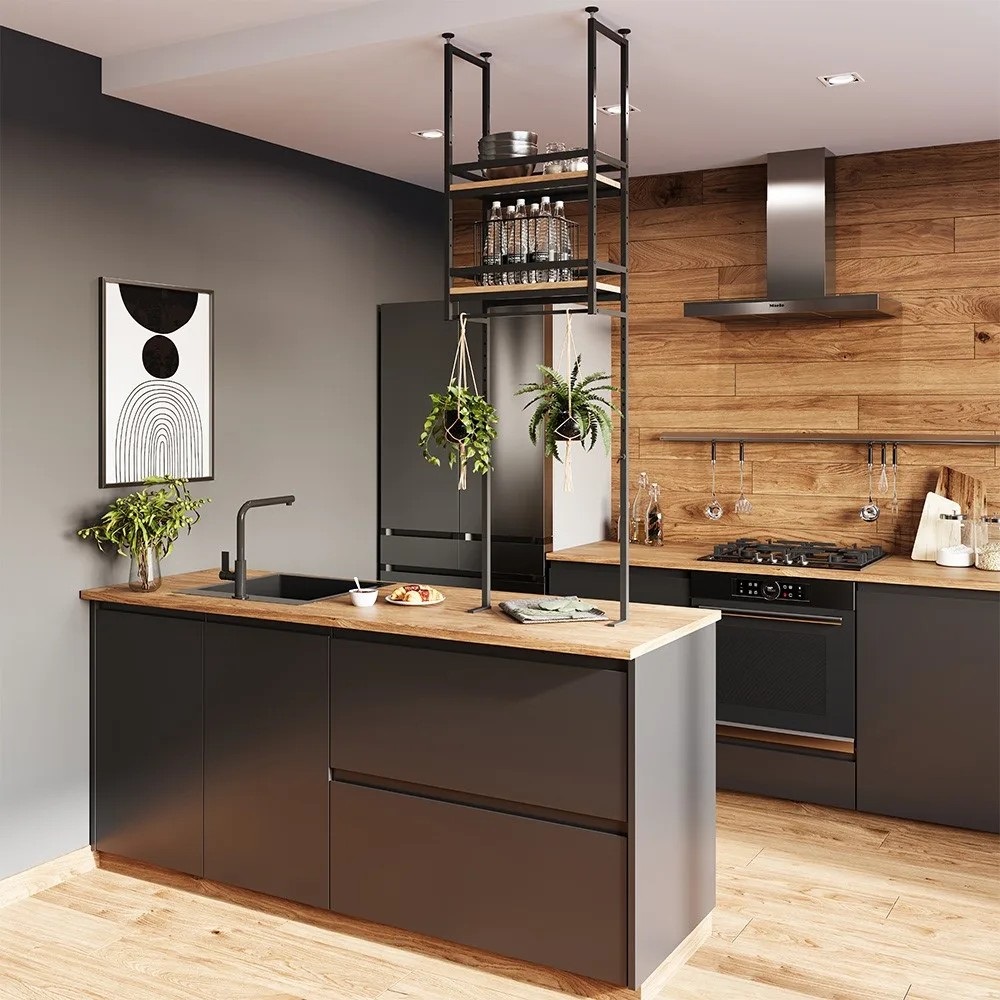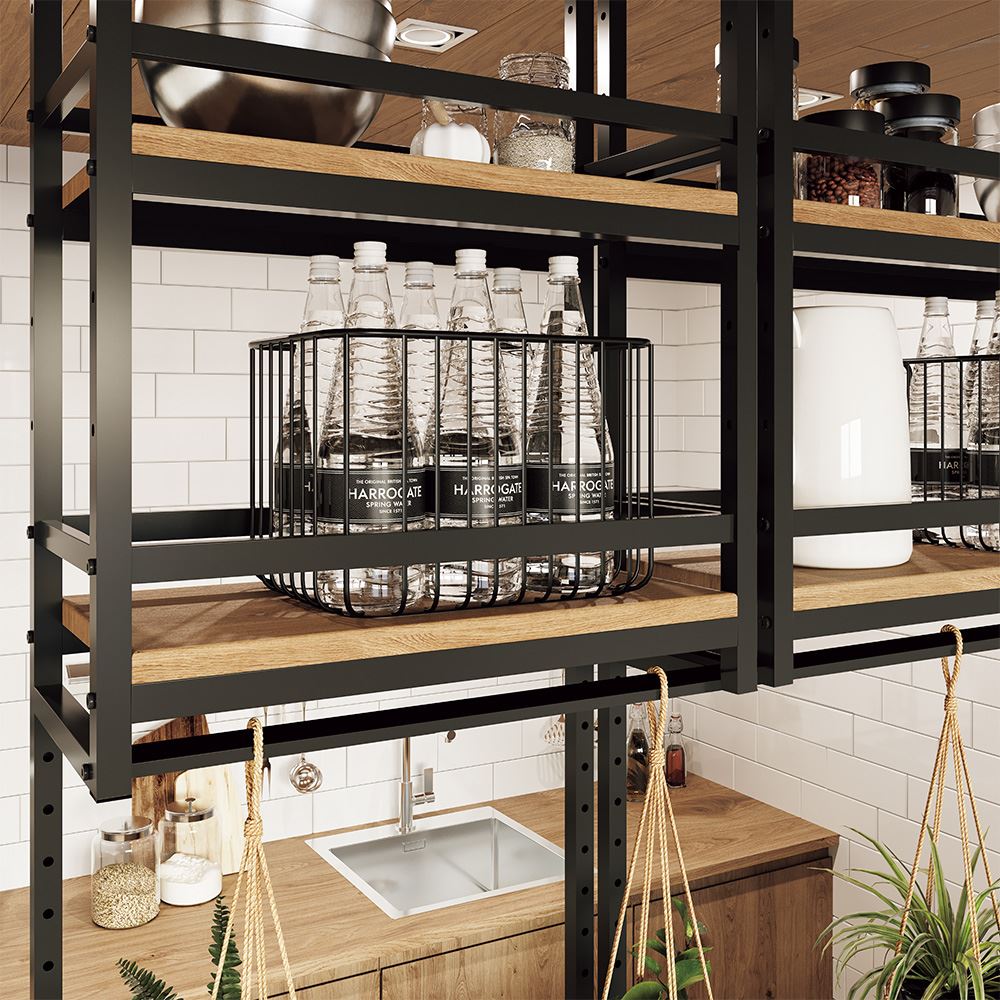 スチールと木目棚板の異素材ミックスがインダストリアルな雰囲気を演出。