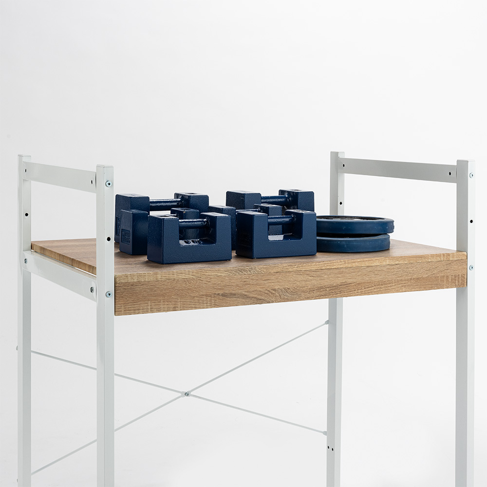 耐荷重約50kg。耐荷重試験で表記の2倍の重りを載せて1日後の変化を測定しても、異常なしでした。 ※写真は別売りの「天板あり」タイプです。