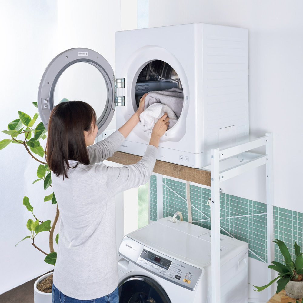 使用イメージ(ア)ホワイト 乾燥機設置面の高さが3段階で調整できるので乾燥機が使いやすく、ご自身の身長や設置場所に合わせて出し入れがラクな高さに設定できます。 ※写真は別売りの天板無しタイプ幅85cmです。