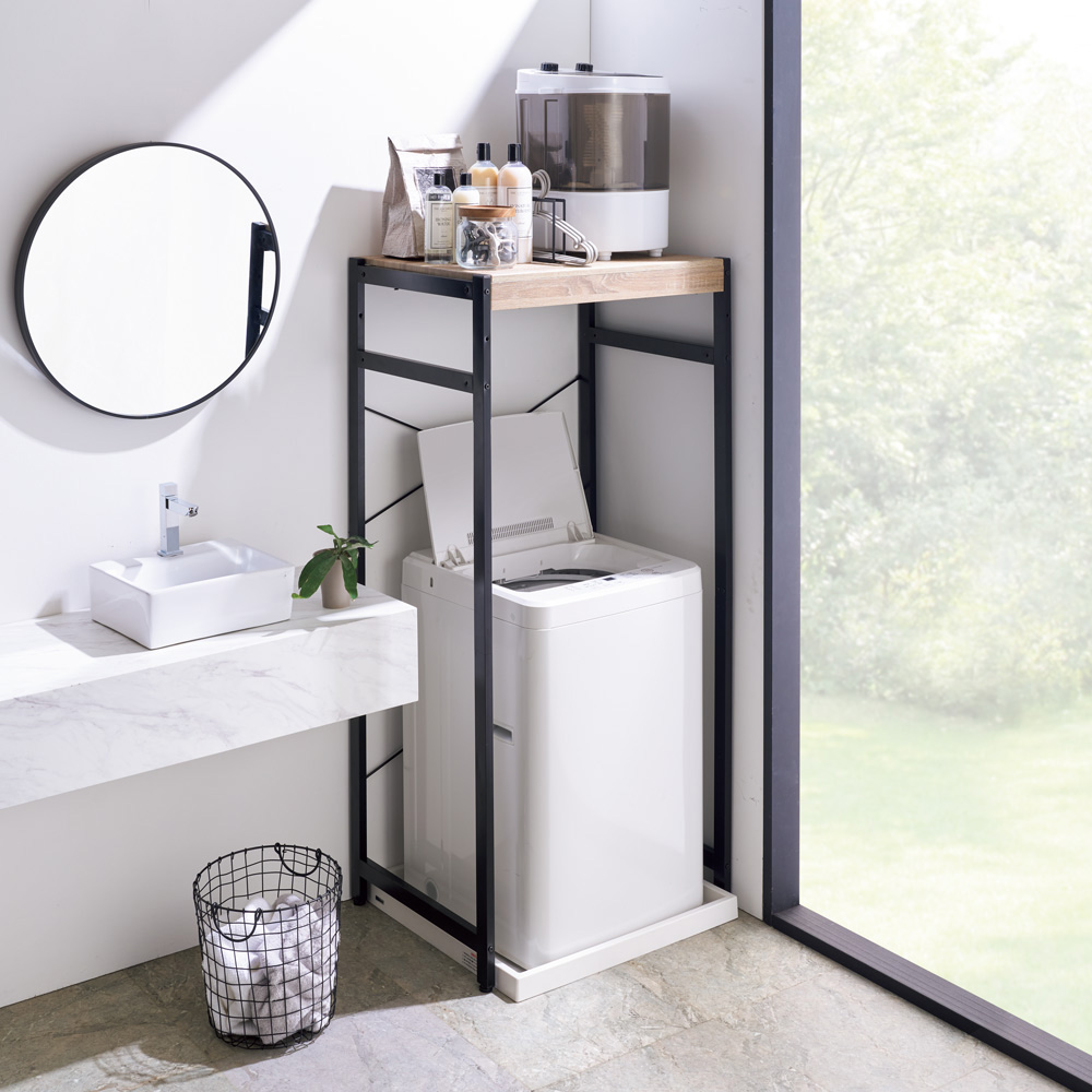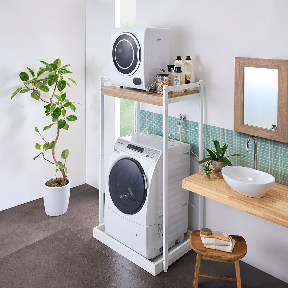 揺れに強く、安定感のある頑丈なランドリーラック。衣類乾燥機や小型洗濯機など重量のあるものも天板に置いて使えるほか、天板を外して衣類乾燥機を本体にしっかりネジで固定することもできるので、揺れにくさが段違い。天板は洗剤ストックの収納や作業台としても幅広く使え、木目柄でインテリア性もGOOD! ※シリーズ商品には「天板なし」タイプもございます。「揺れや振動に強いランドリーラックを!」という多くのお客さまの声から開発●衣類を乾燥する際の揺れや振動が気になる―。そんなお悩みにお応えして開発した乾燥機ラックです。●がっちりと安定感のある頑丈な構造に設計した本体に、着脱可能な天板をプラス。●天板を取り付けて使うことも、天板なしで乾燥機を固定して使うことも可能で、幅広い使い方や暮らしの変化に対応しやすくしました。●天板を外して乾燥機をラックに固定すれば、濡れた重たい衣類を乾燥する際にも、より揺れや振動を低減します。ここが違う! こだわりの頑丈設計●天板耐荷重は約50kg。(耐荷重試験では倍の約100kgをクリア)。●脚部には幅2cm奥行4cmの頑丈な角パイプを使用。揺れに強い安定感を確保しました。●背面にX型の補強バーを上下2段に設けて強化。揺れにくさを高めています。天板は広々とした内寸幅65.5×奥行56cmで、収納や作業にも大活躍●天板は乾燥機や小型洗濯機を置くほか、洗剤類などのストック場所にも。●つけ置き洗い・シミ抜きなどの作業スペースや、入浴時の着替えのちょい置きにも活躍します。天板を外して使えば、さまざまな衣類乾燥機の固定にフレキシブルに対応●固定方法も簡単。お手持ちの乾燥機の底面にある固定穴に合わせて、本体の固定バーの位置を調節し、ネジで留めるだけ。●固定バーは可動式なのでさまざまな乾燥機の機種に対応できて、これまで乾燥機メーカー純正ラック以外では難しかった固定が可能に。●乾燥機を買い替えてもラックはそのまま使えて安心です。底面の排水ホースにも対応●天板を外すと枠組みのみになるので、乾燥機の底面から出ている排水ホースも位置を問わず通せます。●現在は置き型タイプの乾燥機を使っているけれど、次は底面に排水ホースがあるタイプの乾燥機を、とお考えの方は、ぜひこちらをご検討ください。洗濯機の上の空間を有効活用。狭いランドリーにも置きやすい●洗濯機の上のデッドスペースを利用して乾燥機を置けるので、これまで置き場がなくてあきらめていた方にもおすすめ。●乾燥機を床置きしていた方も、本商品ならランドリールームの空間を広く使えます。●背面の2重の補強バーの上段は、コンセントや蛇口を避けて2段階に高さ調節可能。●「幅71cmタイプ」は幅64cmの防水パンをまたいで置けるサイズです。天板は高さ調節3段階。濡れた洗濯物を移し替えるのもスピーディで、家事を時短●使う人の身長や設置場所に合わせて10cm単位で3段階に高さ調節可能。●洗濯物を出し入れしやすい高さに設定できて、洗濯後の衣類も流れ作業でラクラク乾燥機に移し替え完了。●洗濯機から乾燥機までの動線が最短距離ですみ、家事の時短にも役立ちます。●ドラム式洗濯機はもちろん、蓋を開けるのに高さが必要な1枚蓋タイプの縦型洗濯機にも対応します。インテリアになじむよう、デザイン性も重視●天板は幕板一体型のL型形状で、前からは厚い木天板のように見える高級感あるデザイン。●脚部の角パイプは頑丈でありながら、前から見ると幅2cmとすっきりスリム。●ランドリー空間に溶け込むシンプルなデザインも魅力。乾燥機メーカー純正のラックでは満足できない方にもおすすめです。●本体カラーは清潔感のあるホワイトと、モダンでスタイリッシュなブラックの2色からお選びいただけます。※本商品には、乾燥機の固定に使用するネジなどの留め具は付属しておりません。お手持ちの乾燥機のメーカー取扱説明書をご確認のうえご自身でご用意ください。また、天板耐荷重は設置する乾燥機の総重量(洗濯物の重さを含む)となりますので、ご購入前に衣類乾燥機のサイズ、仕様をご確認ください。シリーズ商品のご案内衣類乾燥機固定&排水ホース対応 頑丈ランドリーラックは以下のシリーズ商品がございます。※このページは天板あり 幅71cmタイプの販売ページです。・天板なし 幅71cm・天板なし 幅86cm・天板あり 幅71cm・天板あり 幅86cm