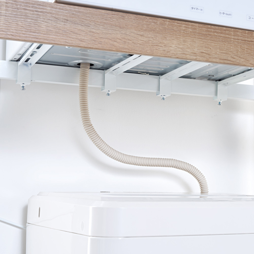 天板に置き型の乾燥機や小型洗濯機を置くことも、天板を外して底面に排水ホースがある乾燥機を固定することも可能です。※写真は別売りの天板なしタイプになります。