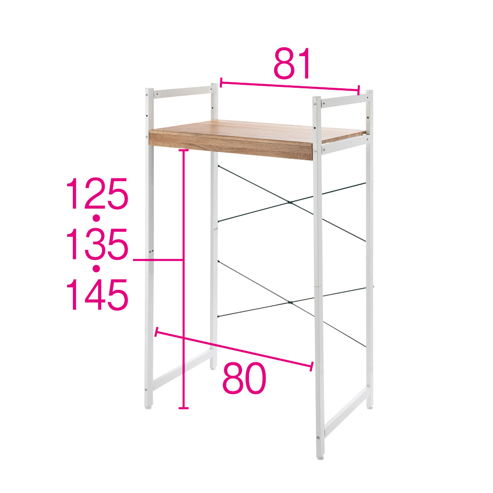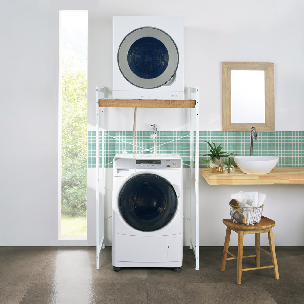 揺れに強く、安定感のある頑丈なランドリーラック。衣類乾燥機や小型洗濯機など重量のあるものも天板に置いて使えるほか、天板を外して本体にしっかりネジで固定することもできるので、揺れにくさが段違い。棚板は洗剤ストックの収納や作業台としても幅広く使えます。天板は木目柄でインテリア性もGOOD! ※シリーズ商品には「天板なし」タイプもございます。「揺れや振動に強いランドリーラックを!」という多くのお客さまの声から開発●衣類を乾燥する際の揺れや振動が気になる―。そんなお悩みにお応えして開発した乾燥機ラックです。●がっちりと安定感のある頑丈な構造に設計した本体に、着脱可能な天板をプラス。●天板を取り付けて使うことも、天板なしで乾燥機を固定して使うことも可能で、幅広い使い方や暮らしの変化に対応しやすくしました。●天板を外して乾燥機をラックに固定すれば、濡れた重たい衣類を乾燥する際にも、より揺れや振動を低減します。ここが違う! こだわりの頑丈設計●天板耐荷重は約50kg。(耐荷重試験では倍の約100kgをクリア)。●脚部には幅2cm奥行4cmの頑丈な角パイプを使用。揺れに強い安定感を確保しました。●背面にX型の補強バーを上下2段に設けて強化。揺れにくさを高めています。天板は広々とした内寸幅80.5×奥行56cmで、収納や作業にも大活躍●天板は乾燥機や小型洗濯機を置くほか、洗剤類などのストック場所にも。●つけ置き洗い・シミ抜きなどの作業スペースや、入浴時の着替えのちょい置きにも活躍します。天板を外して使えば、さまざまな衣類乾燥機の固定にフレキシブルに対応●固定方法も簡単。お手持ちの乾燥機の底面にある固定穴に合わせて、本体の固定バーの位置を調節し、ネジで留めるだけ。●固定バーは可動式なのでさまざまな乾燥機の機種に対応できて、これまで乾燥機メーカー純正ラック以外では難しかった固定が可能に。●乾燥機を買い替えてもラックはそのまま使えて安心です。底面の排水ホースにも対応●天板を外すと枠組みのみになるので、乾燥機の底面から出ている排水ホースも位置を問わず通せます。●現在は置き型タイプの乾燥機を使っているけれど、次は底面に排水ホースがあるタイプの乾燥機を、とお考えの方は、ぜひこちらをご検討ください。洗濯機の上の空間を有効活用。狭いランドリーにも置きやすい●洗濯機の上のデッドスペースを利用して乾燥機を置けるので、これまで置き場がなくてあきらめていた方にもおすすめ。●乾燥機を床置きしていた方も、本商品ならランドリールームの空間を広く使えます。●背面の2重の補強バーの上段は、コンセントや蛇口を避けて2段階に高さ調節可能。●「幅86cmタイプ」は幅80cmまでの防水パンをまたいで置けるサイズです。天板は高さ調節3段階。濡れた洗濯物を移し替えるのもスピーディで、家事を時短●使う人の身長や設置場所に合わせて10cm単位で3段階に高さ調節可能。●洗濯物を出し入れしやすい高さに設定できて、洗濯後の衣類も流れ作業でラクラク乾燥機に移し替え完了。●洗濯機から乾燥機までの動線が最短距離ですみ、家事の時短にも役立ちます。●ドラム式洗濯機はもちろん、蓋を開けるのに高さが必要な1枚蓋タイプの縦型洗濯機にも対応します。インテリアになじむよう、デザイン性も重視●天板は幕板一体型のL型形状で、前からは厚い木天板のように見える高級感あるデザイン。●脚部の角パイプは頑丈でありながら、前から見ると幅2cmとすっきりスリム。●ランドリー空間に溶け込むシンプルなデザインも魅力。乾燥機メーカー純正のラックでは満足できない方にもおすすめです。●本体カラーは清潔感のあるホワイトと、モダンでスタイリッシュなブラックの2色からお選びいただけます。※本商品には、乾燥機の固定に使用するネジなどの留め具は付属しておりません。お手持ちの乾燥機のメーカー取扱説明書をご確認のうえご自身でご用意ください。また、天板耐荷重は設置する乾燥機の総重量(洗濯物の重さを含む)となりますので、ご購入前に衣類乾燥機のサイズ、仕様をご確認ください。シリーズ商品のご案内衣類乾燥機固定&排水ホース対応 頑丈ランドリーラックは以下のシリーズ商品がございます。※このページは天板あり 幅86cmタイプの販売ページです。・天板なし 幅71cm・天板なし 幅86cm・天板あり 幅71cm・天板あり 幅86cm