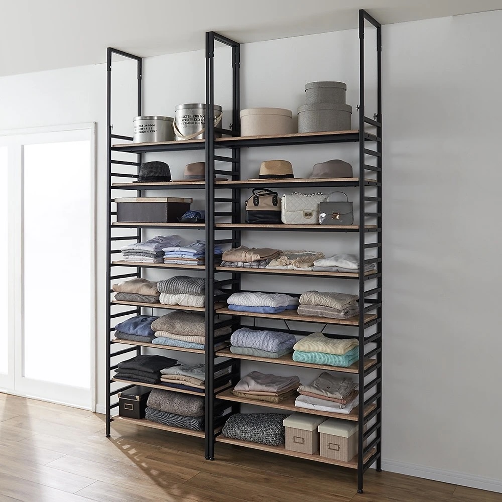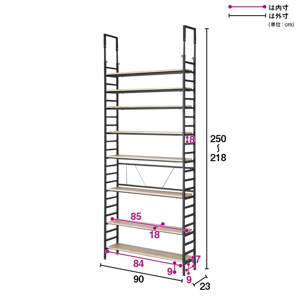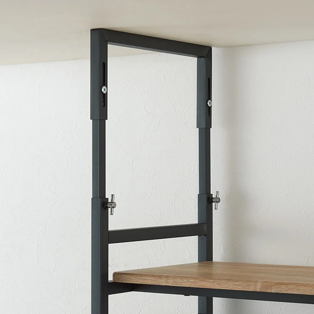 辛口ルックスの突っ張りラック。本やオーディオ、インテリアグリーンなど、壁一面にお気に入りをディスプレイ。インテリアスタイルにこだわった、ブルックリンスタイルの壁面ラックです。重厚な見た目と確かな頑丈設計ブラックスチールとウッドの組み合わせがモダンな人気の頑丈ラック!突っ張り部分のデザインなどディテールにもこだわった逸品。大量収納に耐え得る頑丈仕様で、長く使える収納ラックです。選べる奥行サイズ奥行23cm コミック・CD・小物のディスプレイに!圧迫感の無い薄型サイズ。奥行内寸18cmの棚板にはコミックや文庫本、CDの収納として便利。壁面を生かした薄型のディスプレイスペースとしても活躍。選べる奥行サイズ奥行33cm雑誌やA4ファイルボックスが納まる奥行内寸28cmの棚板。書類以外にもキャンプグッズを収納したり、玄関でシューズラックとして使用したり、幅広い用途でお使いいただけます。選べる奥行サイズ奥行43cmアンプ、スピーカー等の音響家電やリビング家電までも納まる深型サイズ。奥行内寸38cmの棚板にはレコードなども納まります。衣類の収納にもおすすめです。大量収納を支える耐荷重20kgの頑丈棚板2本の角パイプの上に棚が乗っている頑丈仕様。サイドのフレームにしっかり固定できます。安定感のある突っ張り構造天井に突っ張る構造なので安定感があり、壁一面を収納としてフル活用出来ます。耐震対策としても突っ張り構造は安心材料のひとつです。機能だけでなく、見た目にもこだわった突っ張りデザインを採用しました。効率良く収納できる可動棚仕様棚板は全て8cm間隔で可動出来るので、収納物に合わせて高さ設定できます。サイドラダーも収納として活用サイドラダーに自前のフックを取り付ければ、トートバッグや帽子、鍵など吊り下げて収納としても活用出来ます。