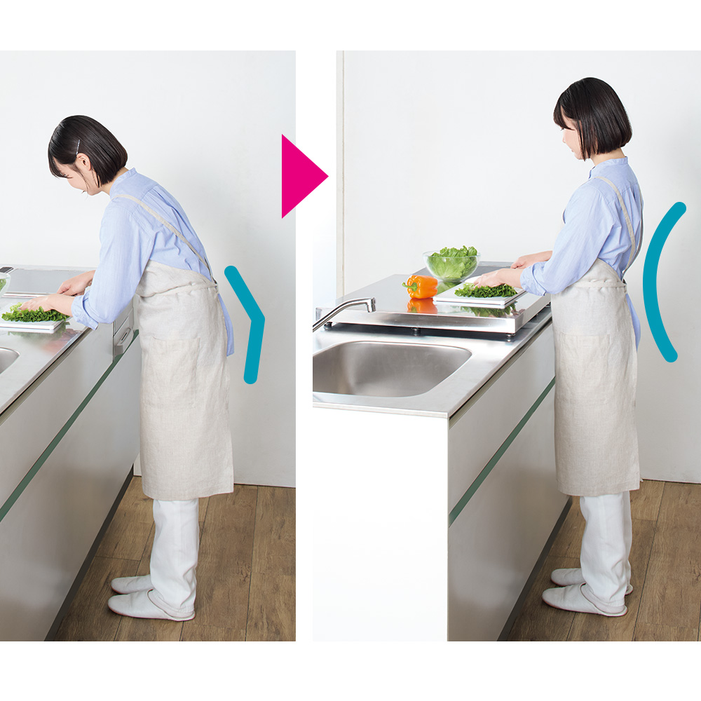 ワークトップをちょい上げすれば姿勢も腰もこんなにラクラク! ※写真はお届けする商品です。