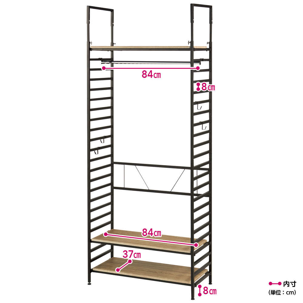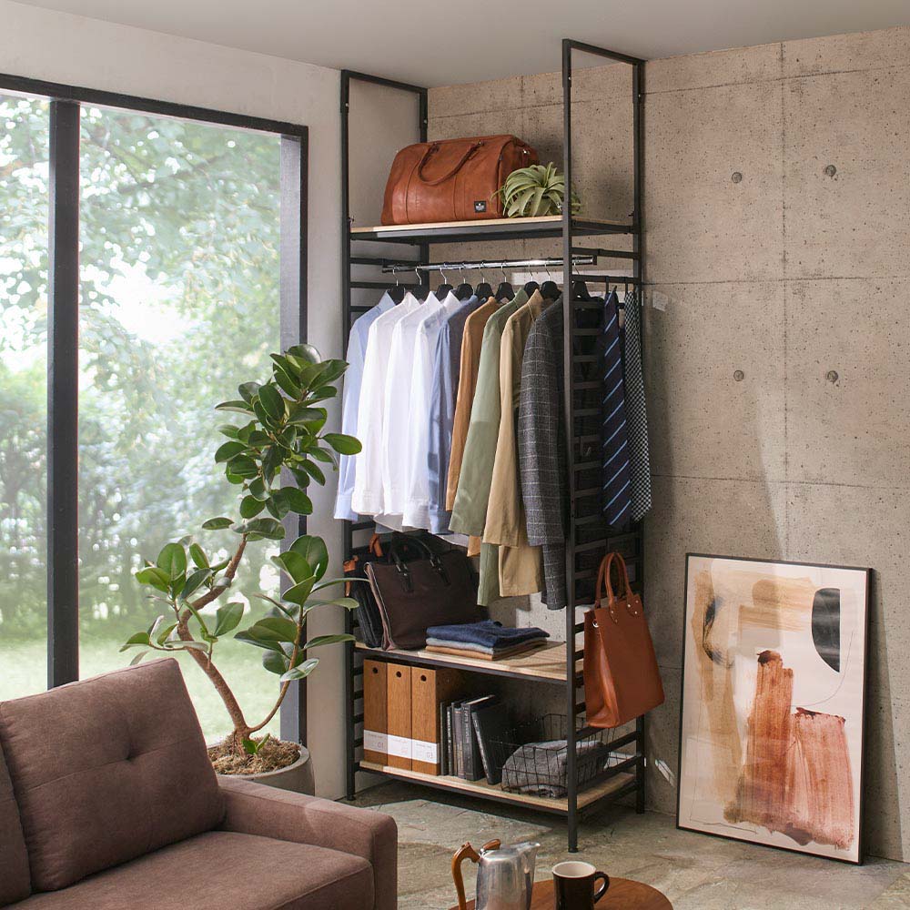 無骨さと洗練された印象が絶妙にマッチする、人気のブルックリンスタイル。ディテールにもこだわった突っ張り式で、デザイン性と安定性を両立。ハンガーと棚収納を組み合わせれば、眺めていても気分が上がる自分仕様の収納空間をつくれます。写真左から棚3枚ハンガー1段・幅90cmタイプ、棚1枚ハンガ―2段・幅90cmタイプ機能とデザインを両立した逸品マットな質感のスチールと木目調棚板の異素材ミックスがモダンなハンガーラック。ディテールにもこだわった天井突っ張り式で、壁一面を収納としてフル活用出来ます。大量収納に耐え得る頑丈仕様で、長く使える収納ラックです。写真左から棚1枚ハンガ―2段・幅120cmタイプ、棚3枚ハンガー1段・幅60cmタイプ絵になる収納を自分仕様で楽しむ衣類はもちろん本やオーディオ、インテリアグリーンなど、壁一面にお気に入りをディスプレイ。 深すぎない、ほどよい奥行43cmでさまざまな物の収納に便利です。背板がなくサイドフレームも抜け感のあるラックなので、2台並べても圧迫感がありません。写真は棚3枚ハンガー1段・幅120cmタイプ雑多なものであふれがちな玄関にも靴以外にもキャンプグッズやガーデニング用品、ペットのお散歩グッズなど、さまざまな物を置きたい玄関の収納ラックにもおすすめ。可動棚板なのでベビーカーやゴルフバッグなど大物のスペースも確保でき、すっきりとした玄関に。内側・外側どちら向きにも取付可能なフックが4個付属して便利。安定性とデザイン性を両立させた天井突っ張り式機能だけでなく、見た目にもこだわった突っ張りデザインを採用しました。耐震対策としても突っ張り構造は安心材料のひとつです。写真右:棚板素材アップ棚板はたたんだ衣類を無理なく置ける奥行37cm棚板は奥行37cm。たたんだデニムなども平積みでたっぷり置けます。水や汚れに強いPVC素材なので、花や観葉植物などを飾っても安心。高さを変えられる耐荷重20kgの頑丈棚板棚板は収納したい物に合わせて8cm間隔で設置でき、サイドバーに引っ掛けるだけの仕様なので間隔を変えたいときの設置し直しも簡単です。背板がないので壁のスイッチやコンセントも活用できます。奥行・高さを調整できる頑丈なハンガーバーハンガーバーはハンガーの奥行などに合わせて前後に可動し、高さも8cm間隔で設定できるので、衣類に合わせて効率よく設置できます。ハンガーバー1本あたりの耐荷重は安心の30kgなので、たっぷり掛けられてスペパアップ!脚部にまでこだわった設計脚部のアジャスターで高さの微調整が可能。がたつきもなく安定して設置できます。最下段の棚位置はお好みで設定できるので、ロボット掃除機の格納場所にも。狭いスペースにも設置可能なサイズ展開ブルックリンハンガーラックシリーズ商品は、棚3枚・ハンガー1段タイプ(60cm、90cm、120cmの3タイプ)と、ハンガ―2段・棚1枚タイプ(60cm、90cm、120cmの3タイプ)があり、用途やお部屋に合わせてお選びいただけます。