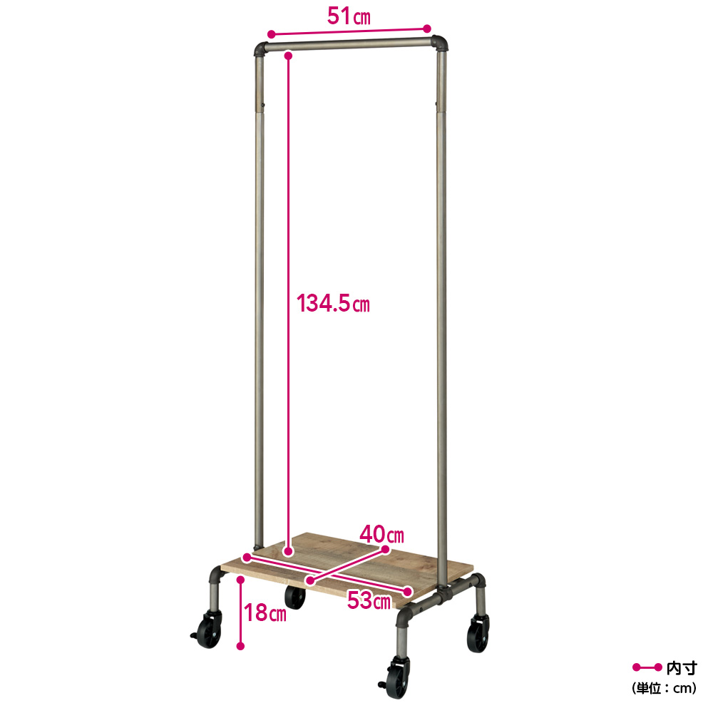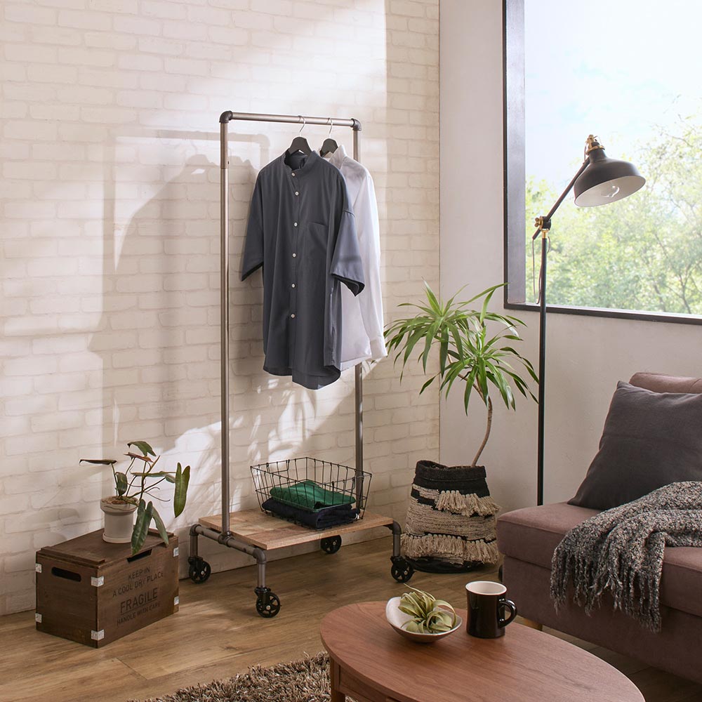 マットな質感のガス管デザインに、棚板も本物の古材さながらの見た目に仕上げました。置くだけで絵になるショップのようなハンガーラック。ビンテージデニムなどこだわりの一着もぐっと引き立ちます。写真左から幅123cmタイプ、幅93cmタイプ、幅63cmタイプインテリアの主役になるハンガーラックハンガーもテイストにこだわりたい、デザインと頑丈さの両面で満足したい、ハードめの服にも似合うハンガーがほしい。そんな方におすすめの、ガス管をイメージしたインダストリアルな雰囲気のビンテージ風ハンガーラック。本物のビンテージさながらの存在感は、置くだけで雰囲気のある空間を演出。頑丈な実用性と特別感のあるルックスを、お手頃に叶えます。写真は幅93cmタイプデザインも実用性も楽しめる1台マットな塗装のパイプに、古材のような味のある棚板の組み合わせ。クールモダンな空間にもしっくりとなじむデザインです。頑丈な造りでたっぷり掛けられる収納力も魅力です。写真は幅123cmタイプお気に入りの服が引き立つ指定席にご自分のワードローブのテイストに合うハンガーラックをお探しの方に。たとえばデニムやTシャツ、革などの素材とも相性ぴったり。リビングに置けばインテリアとして眺めても楽しめます。たたんだ服も置ける便利な棚板付きインダストリアルな雰囲気に合わせた、まるで本物の古材のような木質感が魅力の棚板。たたんだ服やバッグ、靴の収納に便利です。本物の年代物さながらの質感つや消しの塗装に、溶接を施したときに残る色ムラや黒ずみが、こなれたビンテージ感を醸し出します。1台1台微妙に異なった表情が生まれ、それが1点もののような魅力の商品となります。頑丈なインダストリアルデザインパイプ連結部など構造の要(かなめ)も、頑丈さと味わいにこだわったインダストリアルデザイン。実用性に優れながら、ショップ什器のようにおしゃれな雰囲気も楽しめます。本体とマッチするキャスターを採用本体とのバランスがよく、イメージを崩さない大径のキャスターを採用。負荷をしっかりと支え、洋服を掛けたままでも移動がラクにできます。安心のハンガーバー耐荷重ハンガーバーは1本あたり安心の耐荷重約40kgで、たっぷり掛けられてスペパアップ!ハードな見た目どおりのタフな実用性を備えています。デニムや革など重めの衣類にもおすすめです。選べる3サイズビンテージガス管風ハンガーシリーズ商品は、幅63cm、幅93cm、幅123cmの3タイプがあり、収納量やお部屋に合わせてお選びいただけます。