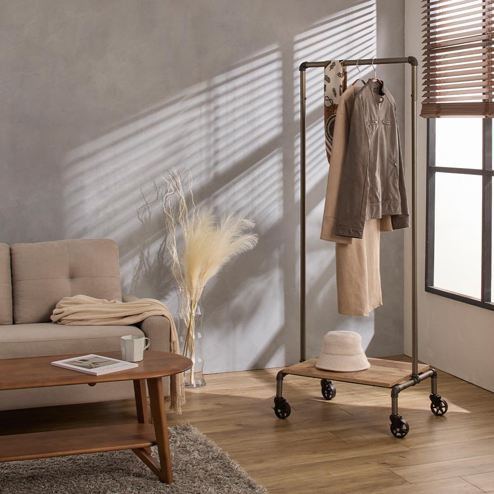 イメージを崩さない大径のキャスターを採用。洋服を掛けたままでも移動ができます。