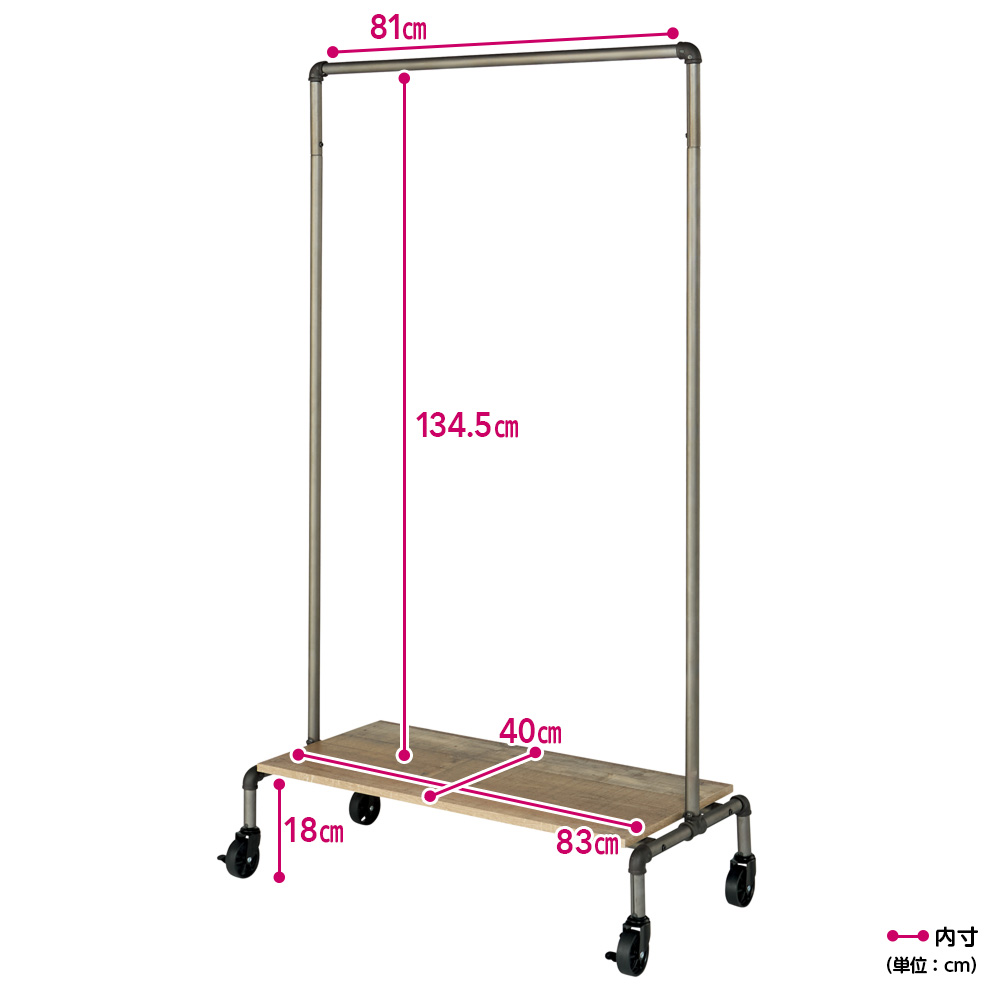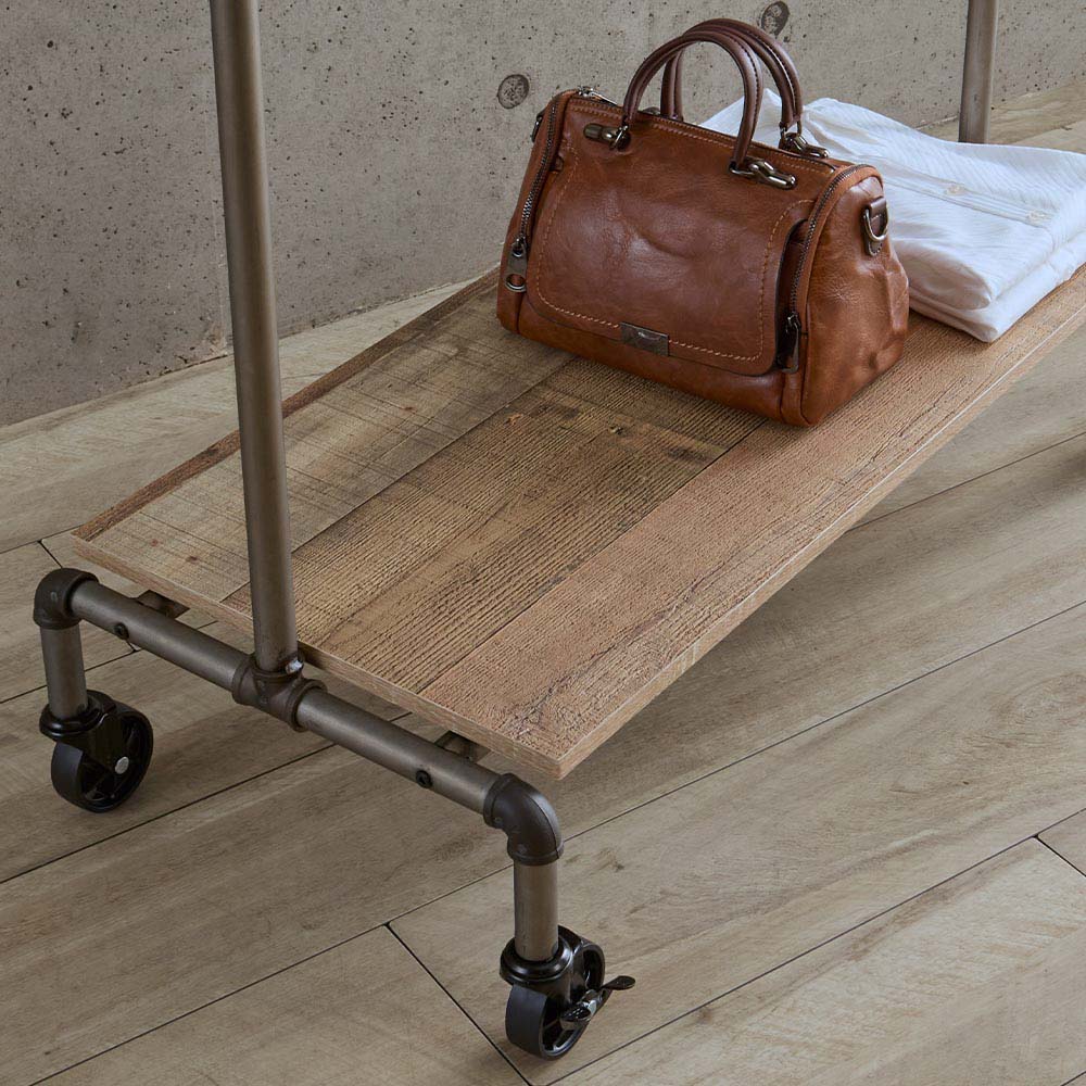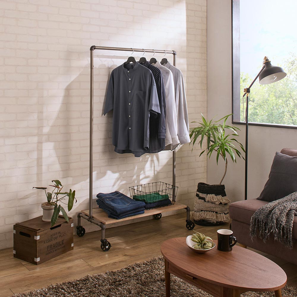 マットな質感のガス管デザインに、棚板も本物の古材さながらの見た目に仕上げました。置くだけで絵になるショップのようなハンガーラック。ビンテージデニムなどこだわりの一着もぐっと引き立ちます。写真左から幅123cmタイプ、幅93cmタイプ、幅63cmタイプインテリアの主役になるハンガーラックハンガーもテイストにこだわりたい、デザインと頑丈さの両面で満足したい、ハードめの服にも似合うハンガーがほしい。そんな方におすすめの、ガス管をイメージしたインダストリアルな雰囲気のビンテージ風ハンガーラック。本物のビンテージさながらの存在感は、置くだけで雰囲気のある空間を演出。頑丈な実用性と特別感のあるルックスを、お手頃に叶えます。写真は幅93cmタイプデザインも実用性も楽しめる1台マットな塗装のパイプに、古材のような味のある棚板の組み合わせ。クールモダンな空間にもしっくりとなじむデザインです。頑丈な造りでたっぷり掛けられる収納力も魅力です。写真は幅123cmタイプお気に入りの服が引き立つ指定席にご自分のワードローブのテイストに合うハンガーラックをお探しの方に。たとえばデニムやTシャツ、革などの素材とも相性ぴったり。リビングに置けばインテリアとして眺めても楽しめます。たたんだ服も置ける便利な棚板付きインダストリアルな雰囲気に合わせた、まるで本物の古材のような木質感が魅力の棚板。たたんだ服やバッグ、靴の収納に便利です。本物の年代物さながらの質感つや消しの塗装に、溶接を施したときに残る色ムラや黒ずみが、こなれたビンテージ感を醸し出します。1台1台微妙に異なった表情が生まれ、それが1点もののような魅力の商品となります。頑丈なインダストリアルデザインパイプ連結部など構造の要(かなめ)も、頑丈さと味わいにこだわったインダストリアルデザイン。実用性に優れながら、ショップ什器のようにおしゃれな雰囲気も楽しめます。本体とマッチするキャスターを採用本体とのバランスがよく、イメージを崩さない大径のキャスターを採用。負荷をしっかりと支え、洋服を掛けたままでも移動がラクにできます。安心のハンガーバー耐荷重ハンガーバーは1本あたり安心の耐荷重約40kgで、たっぷり掛けられてスペパアップ!ハードな見た目どおりのタフな実用性を備えています。デニムや革など重めの衣類にもおすすめです。選べる3サイズビンテージガス管風ハンガーシリーズ商品は、幅63cm、幅93cm、幅123cmの3タイプがあり、収納量やお部屋に合わせてお選びいただけます。