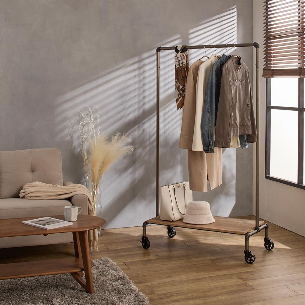 イメージを崩さない大径のキャスターを採用。洋服を掛けたままでも移動ができます。