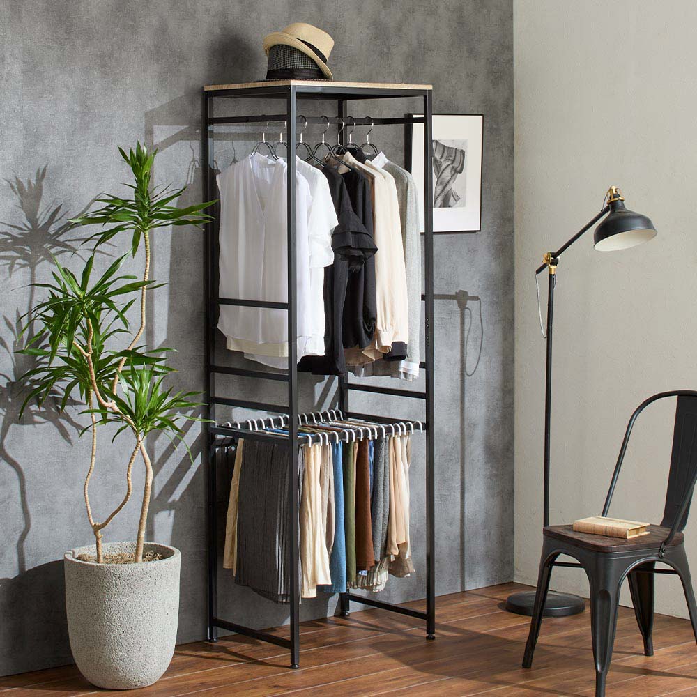 コーディネート例 (イ)ブラック シャープな印象でスッキリした見た目の角パイプを採用。インテリアの邪魔をせず洋服を引き立てます。 ※お届けは写真右の幅60cmタイプです。