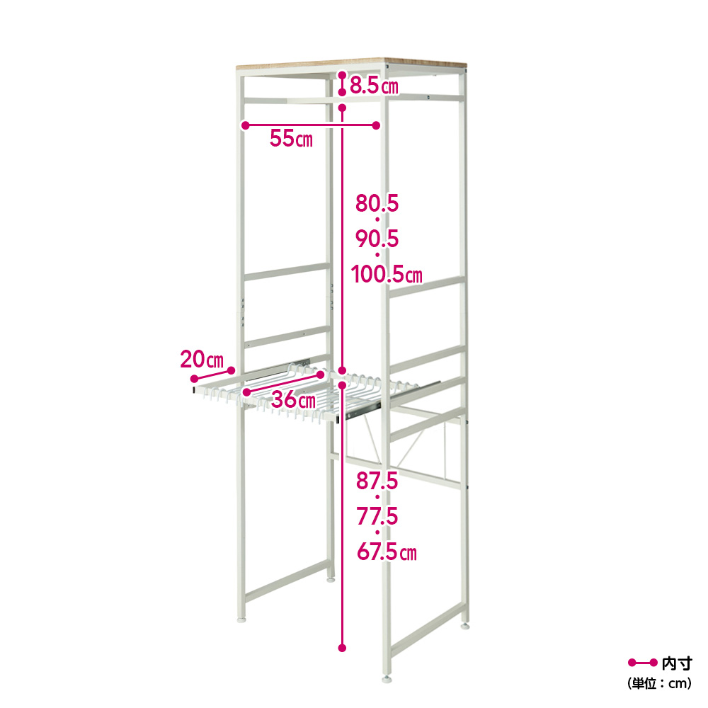 パンツ収納部はレールで手前に引き出せる仕様。上から一目瞭然で選べ、着脱できるハンガーで掛け外しもラクラク。1台でトップスとボトムスが収納できて一覧できるので、毎朝のコーディネートがぐっと時短で決まります。ホワイト 写真左から幅60cmタイプ、幅90cmタイプパンツ収納部が手前に引き出せるたたんで収納するとシワになりがちなパンツは、専用ラックがおすすめ。パンツ収納部が手前に引き出せる仕様なので、上に服が掛かっていてもパンツは引き出せば探しやすく取り出しやすい。1台でトップスとボトムスが揃い一覧できるので、お出かけ前のコーディネートも上下にイメージしやすくスムーズに。写真はホワイト幅90cmタイプ効率収納でスペパアップトップスとボトムスを1台で効率よくたっぷり掛けられるので、ワンルームなどスペースにゆとりがないお部屋にも。天板にもバッグなどが置けて便利です。写真はブラック幅60cmタイプ無駄のないデザインカラーは清潔感のあるホワイトと空間を引き締めるブラックをご用意。シャープな印象でスッキリした見た目の角パイプを採用。インテリアの邪魔をせず洋服を引き立てます。 下段パンツハンガーの高さは3段階調節可能下段のパンツハンガー部は、身長や上段に掛けるトップスの丈、床置きするものの高さに応じて3段階で高さ設定が可能です。スライドレールで開閉スムーズ下段のパンツハンガーはスライドレール式で、滑らかに手前に引き出せます。選びやすさが変わります下段のパンツハンガーを手前に引き出すことで、上段に服が掛かっていても邪魔にならずに楽な姿勢で選びやすく、出し入れしやすい仕様です。着脱可能で使いやすい1本ずつ着脱可能な下段ハンガー部分は衣類が滑りづらい加工を施しています。※(ア)ホワイト・(イ)ブラックともにハンガー部分はホワイト色となります。写真はホワイト幅90cmタイプ選べる2サイズパンツを引き出して選びやすいハンガーラックシリーズ商品は、幅は60cm、90cmの2タイプ、色はホワイトとブラックの2色展開。お部屋に合わせてお選びいただけます。