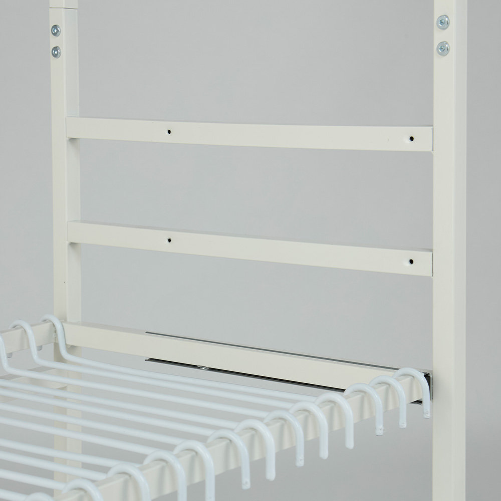 下段のボトムハンガーは、身長や上段に掛けるトップスの丈、床置きするものの高さに応じて3段階で高さ設定が可能です。