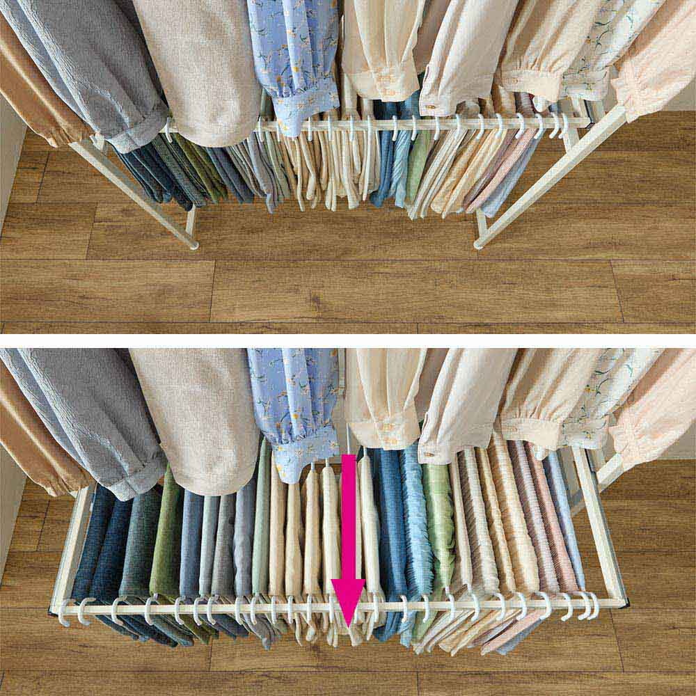 下段のボトムハンガーを手前に引き出すことで、上段の衣類が下段に掛かっていても選びやすく、出し入れいやすい仕様です。