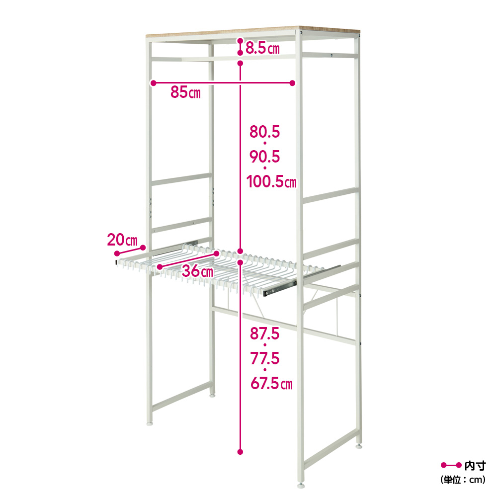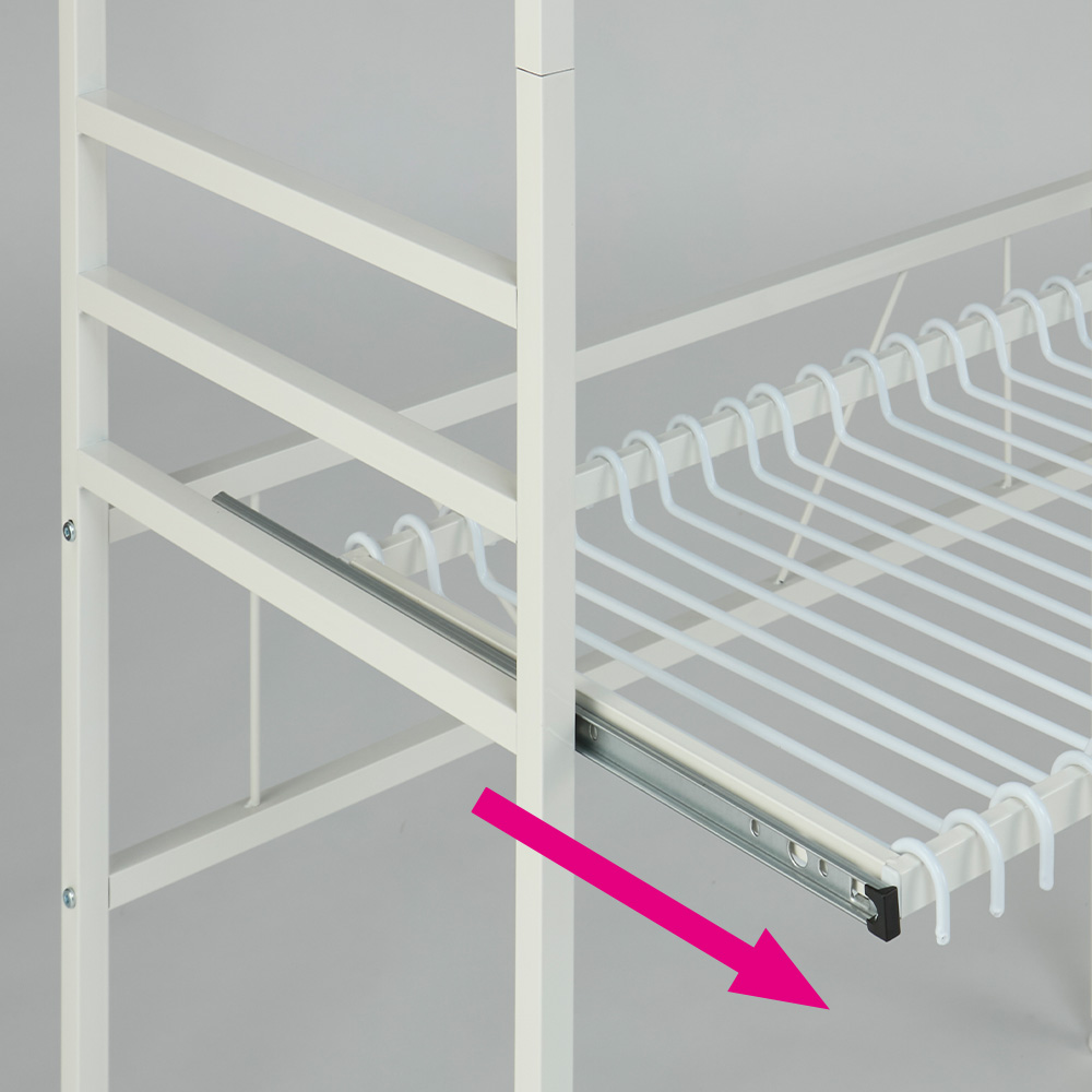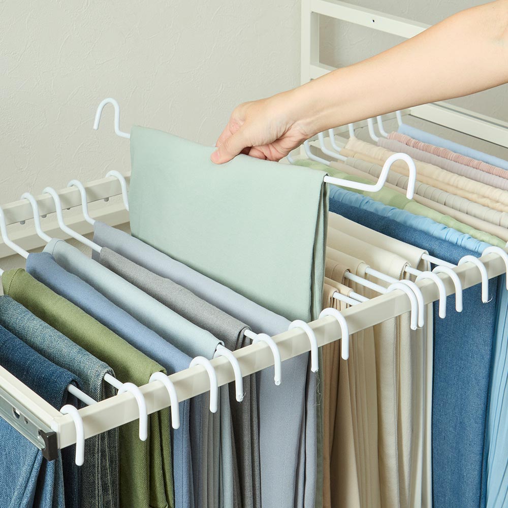 パンツ収納部はレールで手前に引き出せる仕様。上から一目瞭然で選べ、着脱できるハンガーで掛け外しもラクラク。1台でトップスとボトムスが収納できて一覧できるので、毎朝のコーディネートがぐっと時短で決まります。ホワイト 写真左から幅60cmタイプ、幅90cmタイプパンツ収納部が手前に引き出せるたたんで収納するとシワになりがちなパンツは、専用ラックがおすすめ。パンツ収納部が手前に引き出せる仕様なので、上に服が掛かっていてもパンツは引き出せば探しやすく取り出しやすい。1台でトップスとボトムスが揃い一覧できるので、お出かけ前のコーディネートも上下にイメージしやすくスムーズに。写真はホワイト幅90cmタイプ効率収納でスペパアップトップスとボトムスを1台で効率よくたっぷり掛けられるので、ワンルームなどスペースにゆとりがないお部屋にも。天板にもバッグなどが置けて便利です。写真はブラック幅60cmタイプ無駄のないデザインカラーは清潔感のあるホワイトと空間を引き締めるブラックをご用意。シャープな印象でスッキリした見た目の角パイプを採用。インテリアの邪魔をせず洋服を引き立てます。 下段パンツハンガーの高さは3段階調節可能下段のパンツハンガー部は、身長や上段に掛けるトップスの丈、床置きするものの高さに応じて3段階で高さ設定が可能です。スライドレールで開閉スムーズ下段のパンツハンガーはスライドレール式で、滑らかに手前に引き出せます。選びやすさが変わります下段のパンツハンガーを手前に引き出すことで、上段に服が掛かっていても邪魔にならずに楽な姿勢で選びやすく、出し入れしやすい仕様です。着脱可能で使いやすい1本ずつ着脱可能な下段ハンガー部分は衣類が滑りづらい加工を施しています。※(ア)ホワイト・(イ)ブラックともにハンガー部分はホワイト色となります。写真はホワイト幅90cmタイプ選べる2サイズパンツを引き出して選びやすいハンガーラックシリーズ商品は、幅は60cm、90cmの2タイプ、色はホワイトとブラックの2色展開。お部屋に合わせてお選びいただけます。