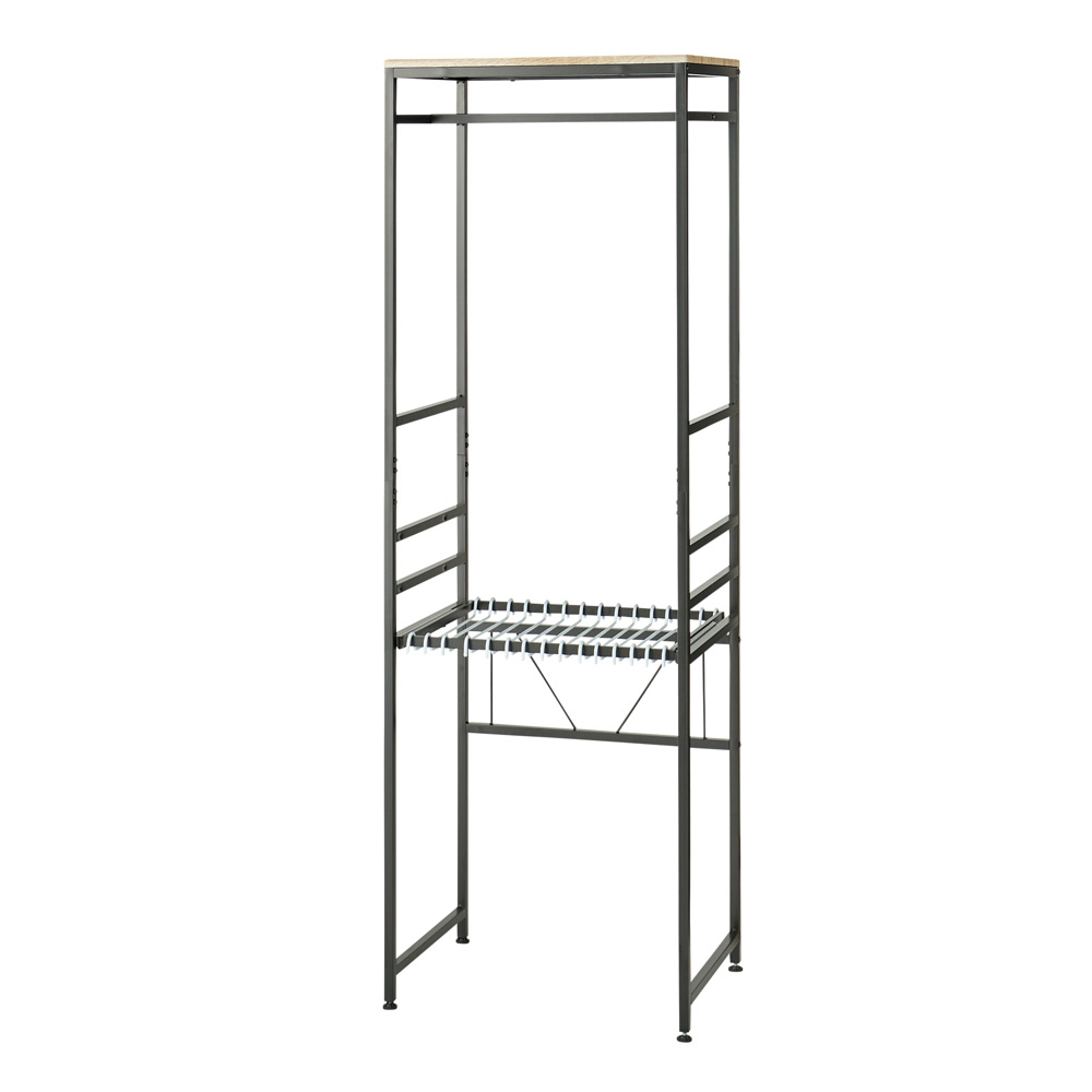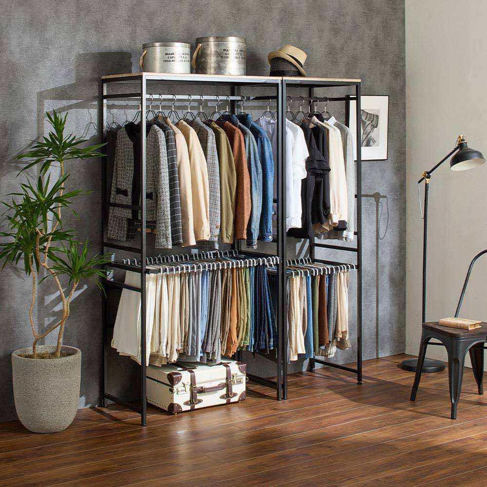 コーディネート例 (イ)ブラック ャープな印象でスッキリした見た目の角パイプを採用。インテリアの邪魔をせず洋服を引き立てます。 ※お届けは写真左の幅90cmタイプです。