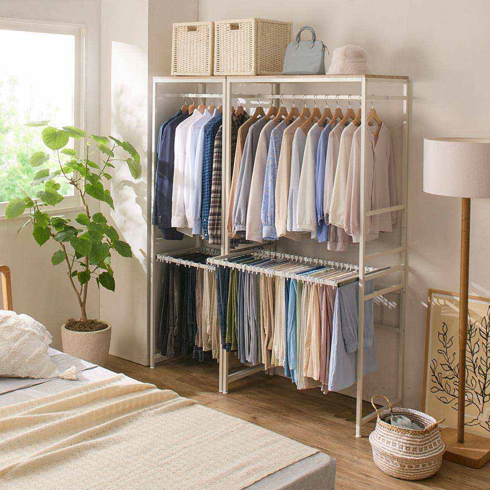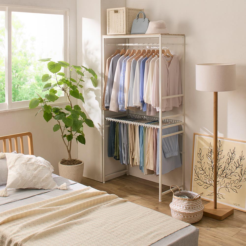 コーディネート例 (ア)ホワイト 家族で衣類を掛ける場所を使い分けても便利です。忙しい朝の支度時間でもコーデが選びやすく、出し入れしやすい。 ※お届けは写真右の幅90cmタイプです。