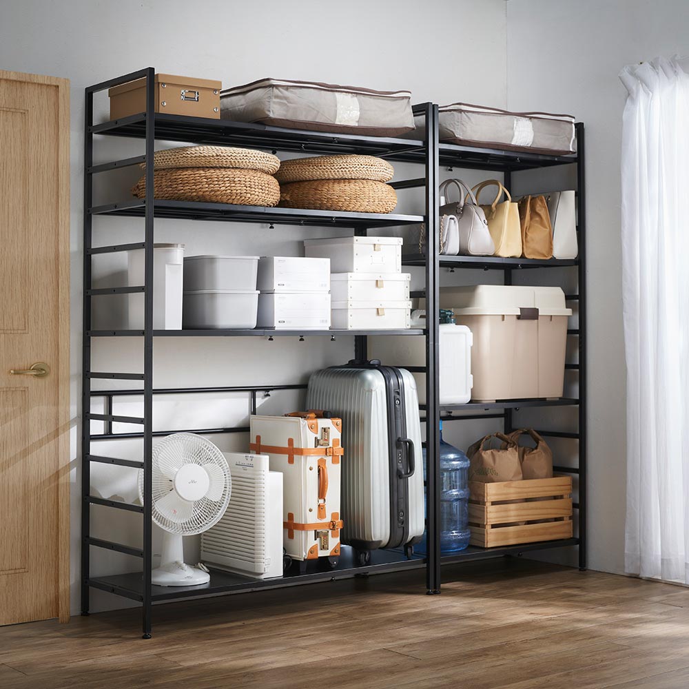 • コーディネート例(イ)ブラック 季節家電、来客用布団、防災用品や備蓄のストックスペースにも。約100kgまで耐えられる頑丈さ。幅伸縮自在、アレンジ自在で使い勝手◎です。 ※写真左から幅80cm〜120cmタイプ、幅51cm〜80cmタイプ