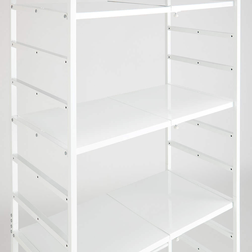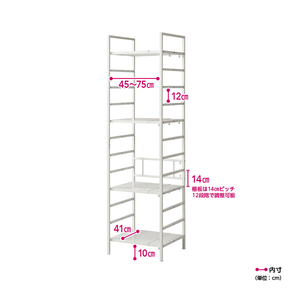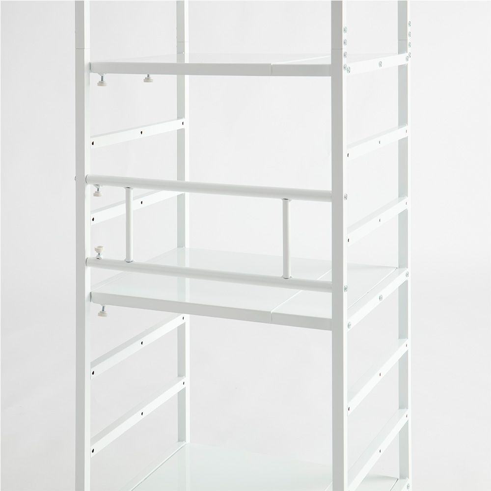 ホワイト 写真は別売りの突っ張りタイプ幅51cm〜80cm可動棚ながら1枚当たり耐荷重25kgを実現棚板1枚当たりの耐荷重25kgの頑丈仕様で、重い物も安心。14cm間隔で高さ調節ができる可動棚は、サイドのバーに掛けるタイプで設置も移動も簡単です。