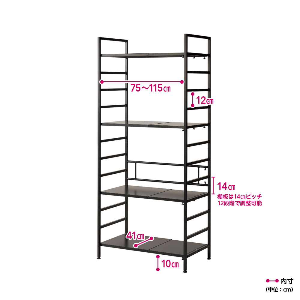• (イ)ブラック 幅伸縮&頑丈棚板で幅ぴったりのパントリーに。大型スチームオーブンも置けます。 ※写真は幅80cm〜120cmタイプ