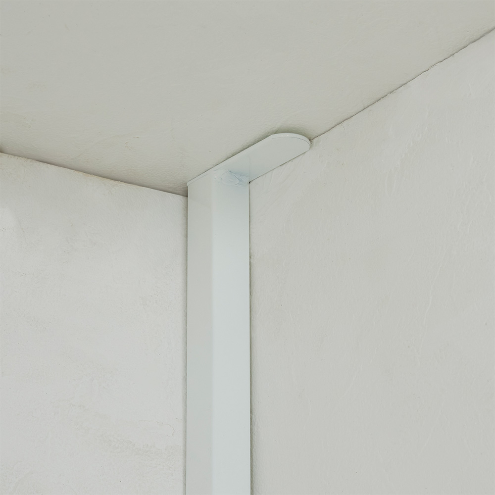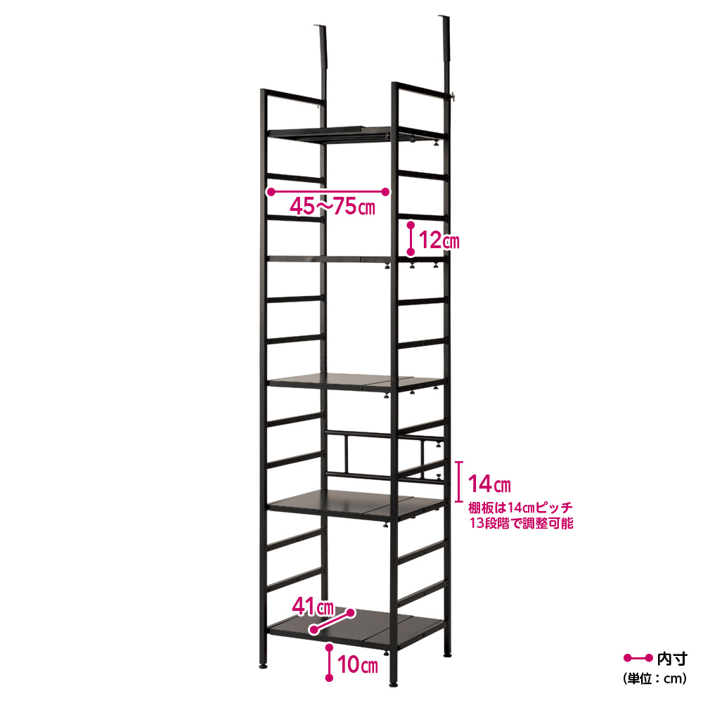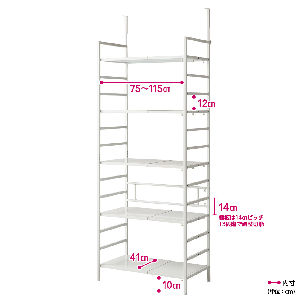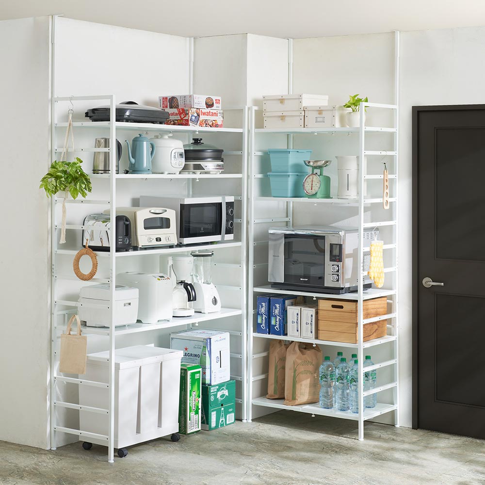 無段階幅伸縮で総耐荷重約100kgの頑丈ラックの天井突っ張りタイプ。大型調理家電から細々した日用品のストックまで、収納したい物やスペースに合わせてオーダーしたようなパントリー収納が完成します。ホワイト 写真左から幅80cm〜120cmタイプ、幅51cm〜80cmタイプ幅伸縮&頑丈棚板&天井突っ張りで幅ぴったりのパントリーに総耐荷重約125kgの天井突っ張り式頑丈ラック。無段階幅伸縮で、オーダーしたようなパントリーが完成します。後ろ側だけで天井に突っ張るので、天板上が広く使えるのも嬉しいポイントです。ホワイト 写真は幅51cm〜80cmタイプ無段階伸縮だから、柱やドアを避けてぴったり設置が可能無段階幅伸縮で置きたい場所にぴったり設置が可能。14cm間隔で高さ調節ができる可動棚は、サイドのバーに掛けるタイプで設置も移動も簡単です。ホワイト 写真は幅51cm〜80cmタイプ可動棚ながら1枚当たり耐荷重25kgを実現棚板1枚当たりの耐荷重25kgの頑丈仕様で、重い物も安心。14cm間隔で高さ調節ができる可動棚と、突っ張り金具が邪魔にならない天板上を使って、収納したい物をスッキリ整理できます。設置場所に合わせて無段階に幅伸縮置きたいスペースに合わせて無段階の幅伸縮が可能。まるでオーダーしたように、どんなすき間にもぴったり収まります。写真右:棚板裏もちろん棚板も無段階伸縮本体に合わせて棚板も無段階伸縮が可能。棚の裏にあるねじを調整するだけで、簡単に幅が変えられます。棚板は水や汚れに強いスチール製棚板はスチール製だから水や汚れに強く、汚れてもサッと拭きとるだけでお手入れ簡単。シンクやコンロの横に置いても安心です。写真左:本体背面 写真右:脚部安定設置が可能な補強とアジャスター付き背面には筋交いとして機能する補強が入っており、横揺れ、ゆがみを防止に。脚部にはアジャスターがついているので、微妙な高さ調節やガタツキ防止に役立ちます。総耐荷重約100kgの棚板頑丈ラック「突っ張りタイプ」は、幅は51cm〜80cm、80cm〜120cmの2タイプ、色はホワイトとブラックの2色展開。お部屋のインテリアや間取りに合わせてお選びいただけます。安心の天井突っ張り式安定感があり、地震対策としても安心の天井突っ張り式。後ろ側だけで天井に突っ張るので、天板上が広く使えるのも嬉しいポイントです。