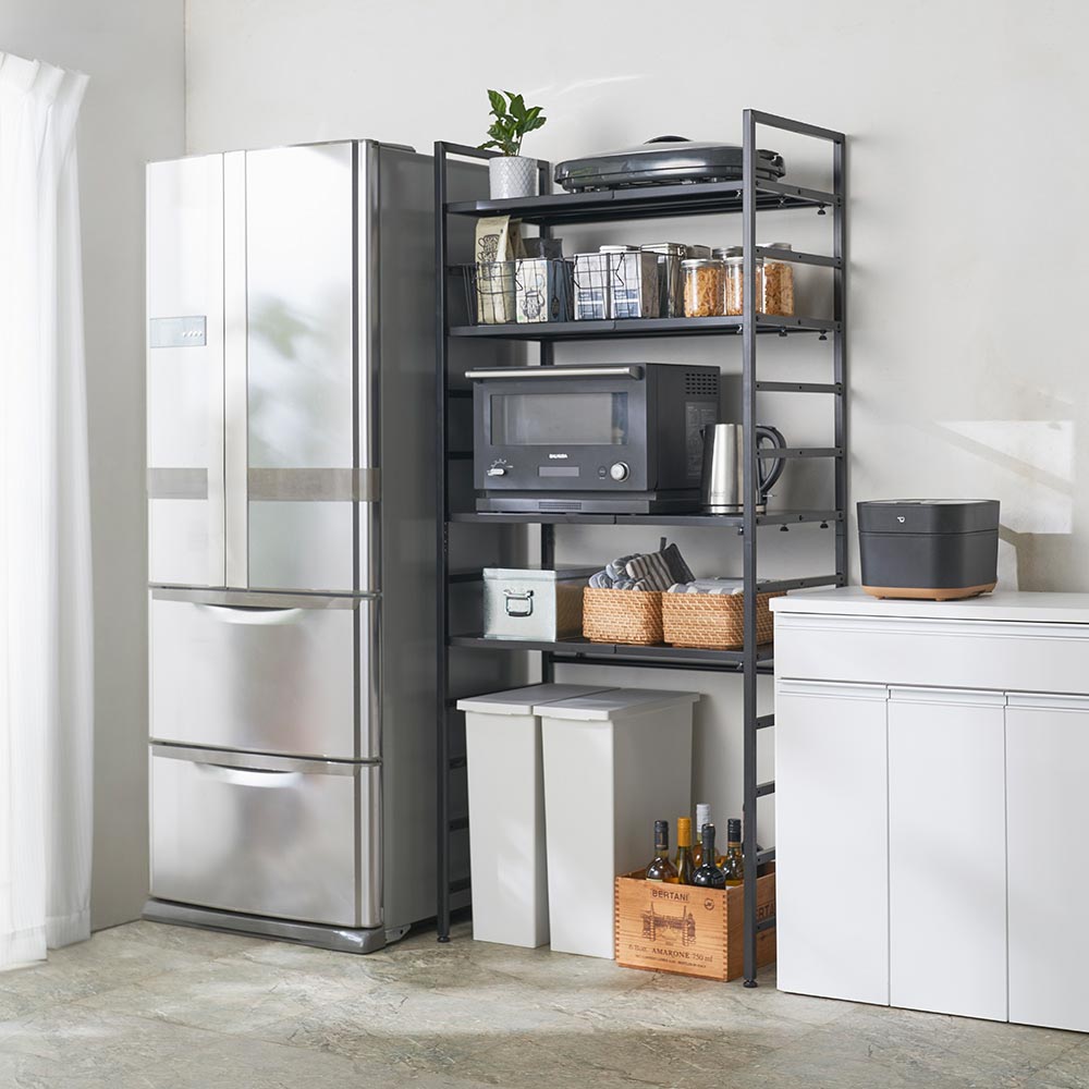 コーディネート例(ア)ホワイト 約125kgまで耐えられる頑丈ラック。伸縮自在、アレンジ自在で使い勝手◎です。大型スチームオーブンも置けます。 ※写真左から幅80cm〜120cmタイプ、幅51cm〜80cmタイプ