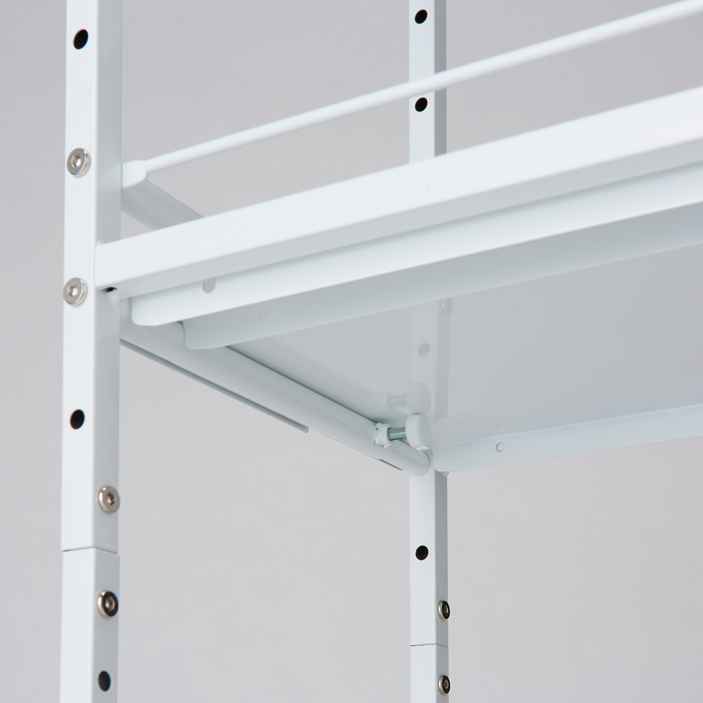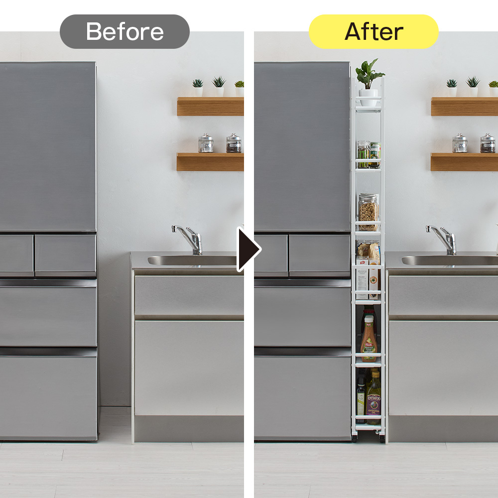 さらにフレキシブルな無段階幅伸縮を採用。こんな隙間でも無駄なくぴったり活用できます。 ※写真は(ア)ホワイト