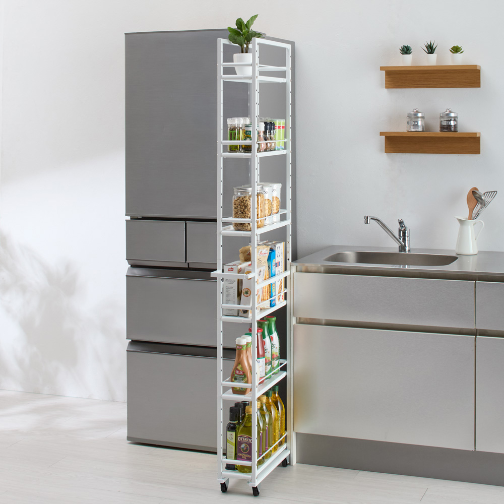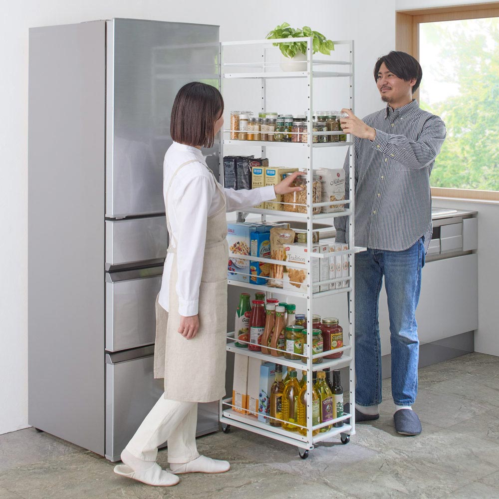 キッチンのすき間にたっぷり収納できるスチール製の頑丈ワゴン。無段階幅伸縮で、さらにぴったり設置できます。幅伸縮と選べる奥行で、置きたい場所にぴったり設置。●1cm単位よりフレキシブルな、無段階幅伸縮を採用しました。●幅は16cmから24cmまで無段階で伸縮します。●お望みの幅にサイズを合わせて、伸縮つまみを締めて固定するだけ。●シンクの奥行やスペースに合わせて、奥行52cmと62cmが選べます。●ちょっとしたすき間が、効率的な収納空間に生まれかわります。スチール製ならではの頑丈仕様で大量収納を実現。●総耐荷重約90kg、棚板1段当たり約15kgの頑丈仕様。●重いボトルや食品ストック類をたっぷり収納できます。●回転せず、前後に動くことに特化したキャスターを採用。●重い物をたくさん収納した状態でもスムーズに引き出せます。●6cmピッチで調節できる可動棚板で、スペースを有効活用できます。細部へのこだわりが叶える使い勝手の良さ。●前板、背板がないので3方向から出し入れできます。●移動時に小さい物が落ちないよう、高さ調節できるこぼれ止め付きです。●こぼれ止めがスリムなので、内容物が見やすく探しやすい。●伸縮つまみは棚板の裏に隠れるので、見た目もすっきりしています。●物を出し入れする時につまみが邪魔にならず、作業がスムーズです。機能的なワゴンで、プロ仕様のキッチンに。●機能性と頑丈さを重視した、プロ仕様のキッチンを演出できます。●カラーは清潔感のあるホワイトとシックなブラックの2色展開。●探しやすく、どこからでも取り出しやすいので、複数人で使う時も便利です。●ご自宅で料理教室を開きたい方にもオススメします。シリーズ商品のご案内無段階伸縮でさらにスペースを生かす幅伸縮すき間ワゴンは以下のシリーズ商品がございます。※このページは幅16cm〜24cm奥行52cmタイプの販売ページです。・幅16cm〜24cm奥行52cmタイプ・幅26cm〜40cm奥行52cmタイプ・幅16cm〜24cm奥行62cmタイプ・幅26cm〜40cm奥行62cmタイプ