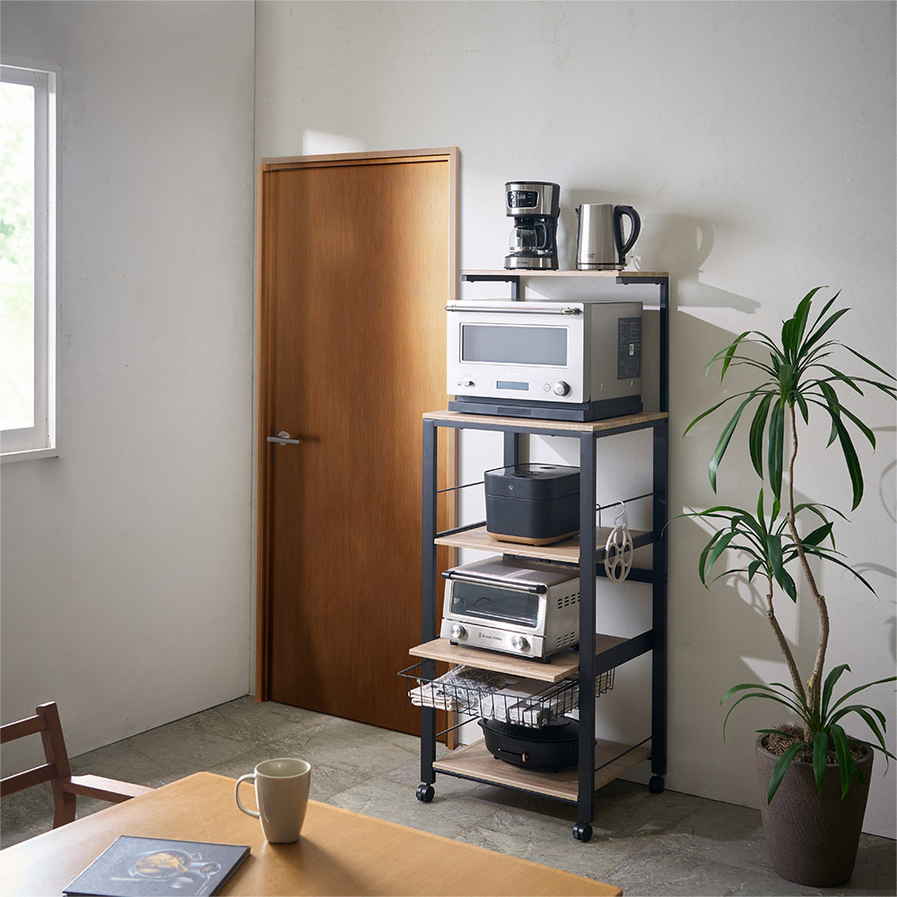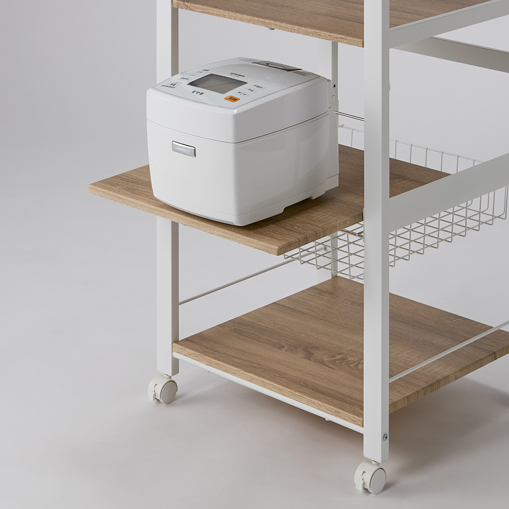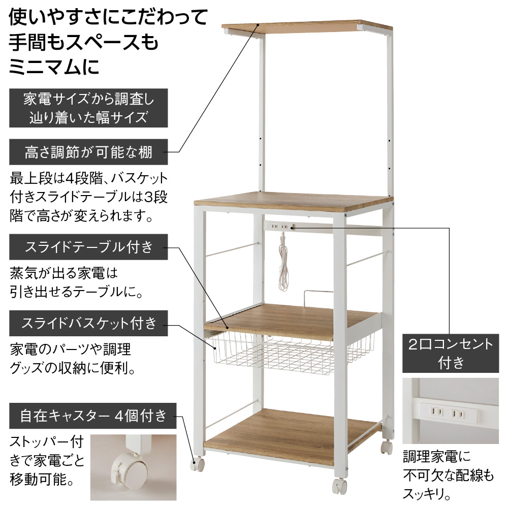 最新家電をスマートに使いこなすために、サイズ設定や細部の仕様にもこだわった家電ステーション。手間も時間もスペースもムダにしたくないというニーズを、これ一台で叶えます。大型スチームオーブンも置ける「頑丈さ」と「サイズ感」です。家電の置き場を確保!タワー型頑丈キッチンワゴン3段ワイド(ア)ブラック上から下までびっしり置ける「タワー型」で家電のお蔵入りを防止!調理家電を縦に配列し、ダイレクトに操作ができるオープンタイプ。 天板・棚板とスライドテーブルに、電子レンジ・炊飯器・ミキサー・トースター・ホームベーカリー・コーヒーメーカーなどの調理家電が収まります。ワイドタイプで大型家電も収納可能3段ワイド(ア)ブラック木目調ボードとスチールの異素材ミックスで、人気のブルックリンテイストにもマッチ。幅56cm奥行53cmのワイドタイプだから、大型スチームオーブンもおまかせ!1枚の棚板に炊飯器、電子クッカーなどを並べて置くこともできます。 高強度設計!安心して家電を置けるワゴン3段ワイド(イ)ホワイト幅広パイプで強度もしっかり!家電の重さを気にせず置ける頑丈設計が自慢です。 「上棚・天板・スライドテーブル・最下段棚」の全てに調理家電を置いてもビクともしない総耐荷重約72kg。お使いの家電に合わせて高さ調節が可能3段ワイド(イ)ホワイト最上段の棚板は高さ調節でき、お手持ちの家電に合わせて設定できます。最上段の高さは123cm・133cm・143cm・153cmの4段階に変えられます。家電使用時に便利なスライドテーブルスライドテーブルは約21cm手前に引き出せるので蒸気が出る炊飯器などを置くことができます。3段階に高さ調節が可能です(画像右)スライドバスケット、便利なコンセント付き左)スライドバスケット 右)2口コンセント(計1500W)ラップやミトンなどが置けるスライド式のバスケット付きで電子レンジや時短家電を使うときに必要な物がすぐそばに収納できて、取りに行く手間もゼロ。使いやすい位置に2口コンセント(計1500W)も付いていて、複数台の家電を置いても配線がごちゃつかず、すっきり。キャスター付きで移動もラクちん左)別売りのホワイト・4段ワイドちょっと動かしたい時やお掃除の際は、家電を載せたまま動かせます。裏側をこまめに掃除でき、火事の原因になりやすい「プラグに溜まったホコリ」も取り除けます。キャスター4個のうち前の2個はストッパー付きで、家電使用時はしっかり固定できます。汚れに強く、お手入れも簡単天板・棚板とスライドテーブルにはPVC化粧板を使用。水や汚れに強く、お手入れもラク。上段は10cmピッチで高さ調節が可能天板に置きたい家電のサイズ、上段の使い方、キッチンの作業動線や置き場所に合わせて棚板の高さ設定が可能。あなたのキッチンと作業スタイルにマッチした家電ワゴンが完成します。最新家電をスマートに使いこなすための工夫を満載最新家電をスマートに使いこなすために、サイズ設定や細部の仕様にもこだわりました。手間も時間もスペースもムダにしたくないというニーズを、これ一台で叶えます。