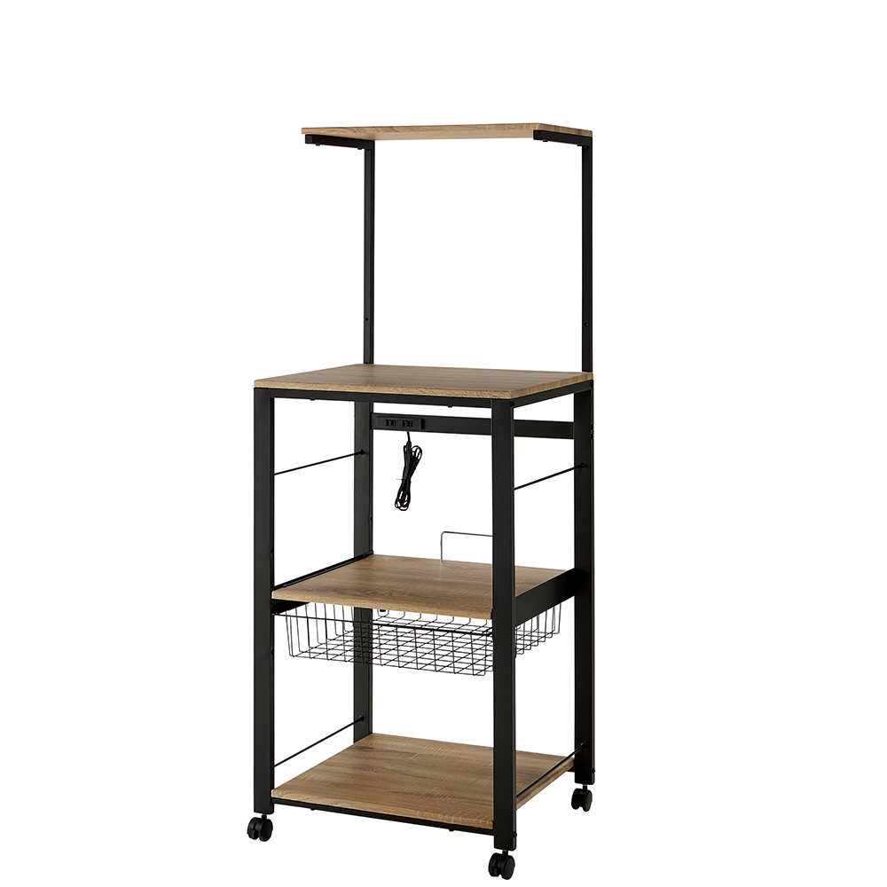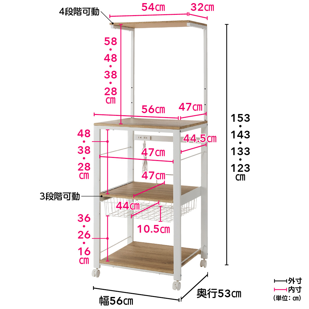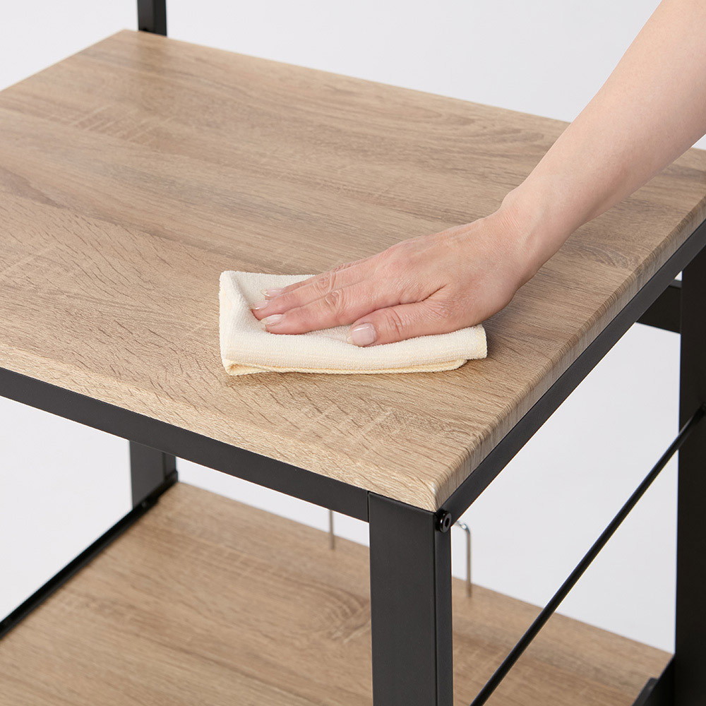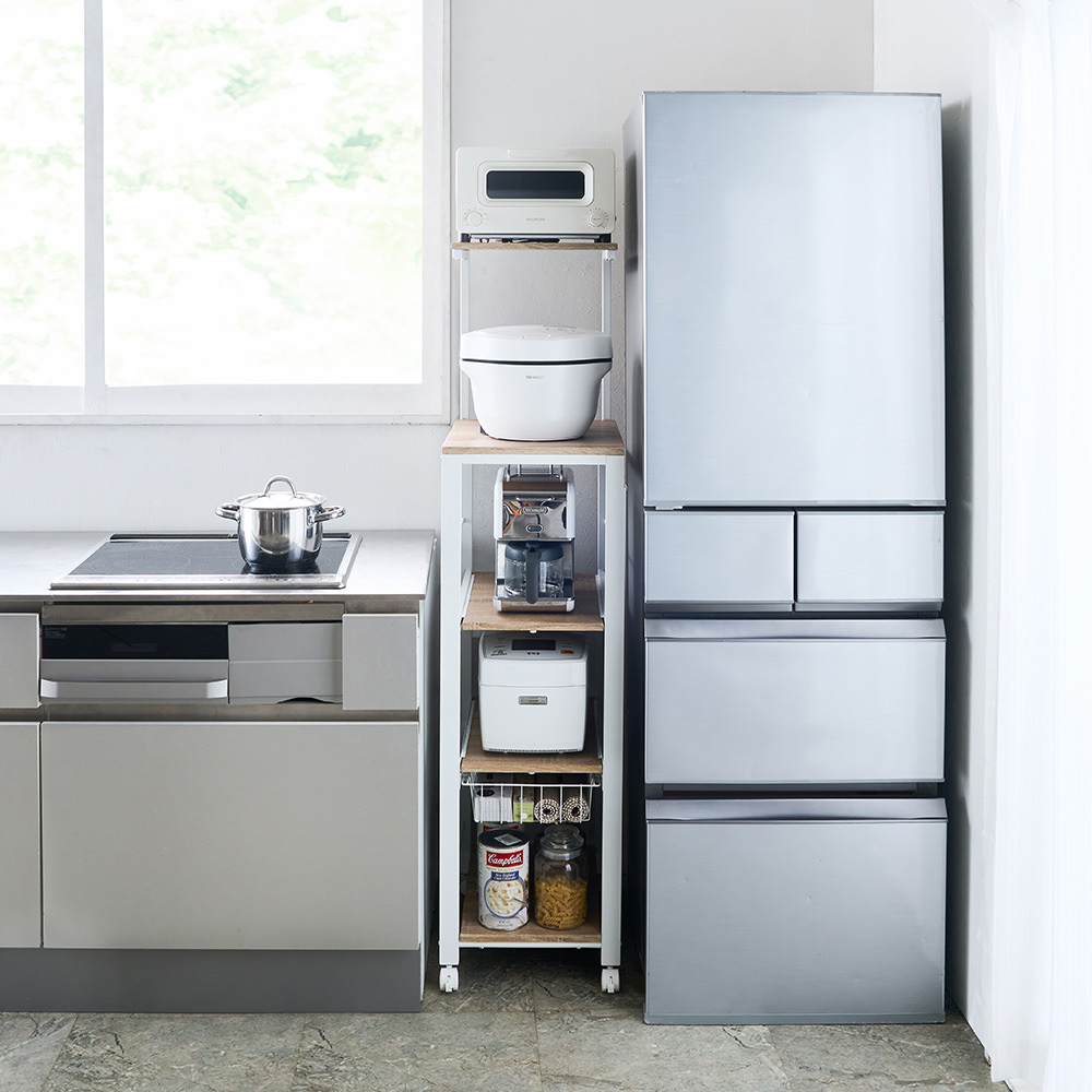 最新家電をスマートに使いこなすために、サイズ設定や細部の仕様にもこだわった家電ステーション。手間も時間もスペースもムダにしたくないというニーズを、これ一台で叶えます。大型スチームオーブンも置ける「頑丈さ」と「サイズ感」です。家電の置き場を確保!タワー型頑丈キッチンワゴン3段ワイド(ア)ブラック上から下までびっしり置ける「タワー型」で家電のお蔵入りを防止!調理家電を縦に配列し、ダイレクトに操作ができるオープンタイプ。 天板・棚板とスライドテーブルに、電子レンジ・炊飯器・ミキサー・トースター・ホームベーカリー・コーヒーメーカーなどの調理家電が収まります。ワイドタイプで大型家電も収納可能3段ワイド(ア)ブラック木目調ボードとスチールの異素材ミックスで、人気のブルックリンテイストにもマッチ。幅56cm奥行53cmのワイドタイプだから、大型スチームオーブンもおまかせ!1枚の棚板に炊飯器、電子クッカーなどを並べて置くこともできます。 高強度設計!安心して家電を置けるワゴン3段ワイド(イ)ホワイト幅広パイプで強度もしっかり!家電の重さを気にせず置ける頑丈設計が自慢です。 「上棚・天板・スライドテーブル・最下段棚」の全てに調理家電を置いてもビクともしない総耐荷重約72kg。お使いの家電に合わせて高さ調節が可能3段ワイド(イ)ホワイト最上段の棚板は高さ調節でき、お手持ちの家電に合わせて設定できます。最上段の高さは123cm・133cm・143cm・153cmの4段階に変えられます。家電使用時に便利なスライドテーブルスライドテーブルは約21cm手前に引き出せるので蒸気が出る炊飯器などを置くことができます。3段階に高さ調節が可能です(画像右)スライドバスケット、便利なコンセント付き左)スライドバスケット 右)2口コンセント(計1500W)ラップやミトンなどが置けるスライド式のバスケット付きで電子レンジや時短家電を使うときに必要な物がすぐそばに収納できて、取りに行く手間もゼロ。使いやすい位置に2口コンセント(計1500W)も付いていて、複数台の家電を置いても配線がごちゃつかず、すっきり。キャスター付きで移動もラクちん左)別売りのホワイト・4段ワイドちょっと動かしたい時やお掃除の際は、家電を載せたまま動かせます。裏側をこまめに掃除でき、火事の原因になりやすい「プラグに溜まったホコリ」も取り除けます。キャスター4個のうち前の2個はストッパー付きで、家電使用時はしっかり固定できます。汚れに強く、お手入れも簡単天板・棚板とスライドテーブルにはPVC化粧板を使用。水や汚れに強く、お手入れもラク。上段は10cmピッチで高さ調節が可能天板に置きたい家電のサイズ、上段の使い方、キッチンの作業動線や置き場所に合わせて棚板の高さ設定が可能。あなたのキッチンと作業スタイルにマッチした家電ワゴンが完成します。最新家電をスマートに使いこなすための工夫を満載最新家電をスマートに使いこなすために、サイズ設定や細部の仕様にもこだわりました。手間も時間もスペースもムダにしたくないというニーズを、これ一台で叶えます。